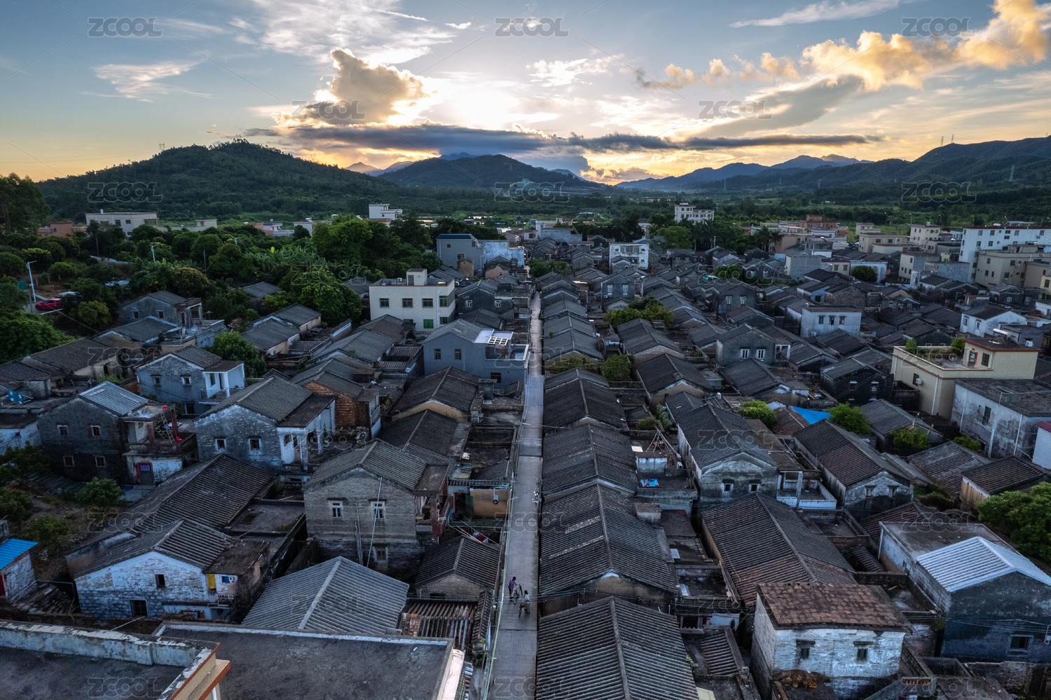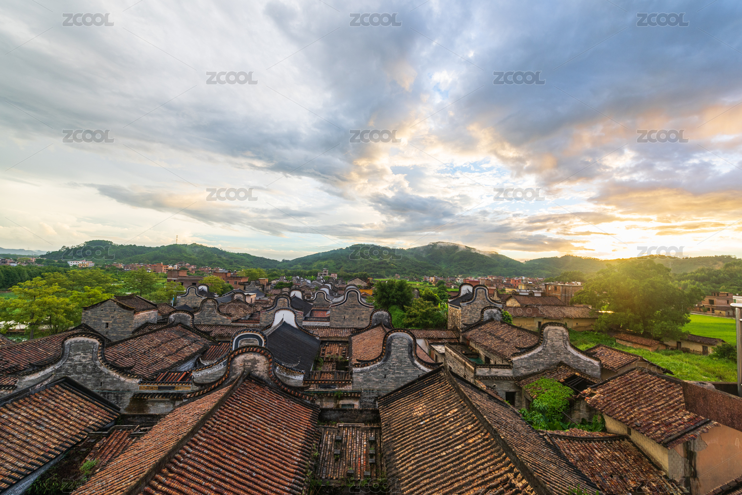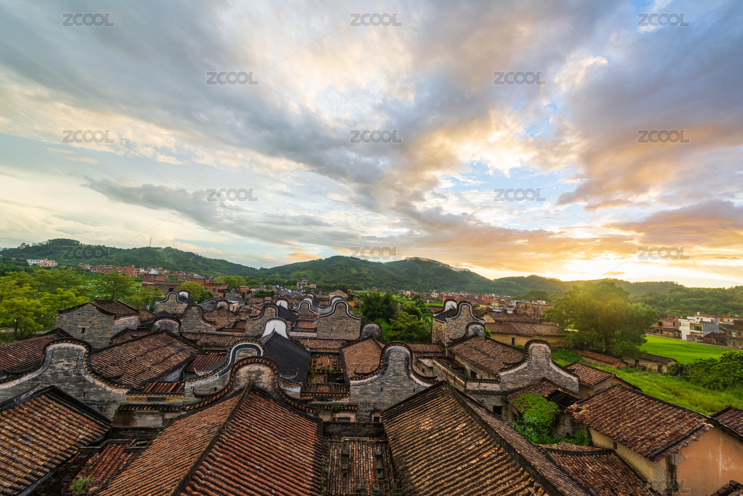 广东清远佛冈上岳古村的雨后日落景观