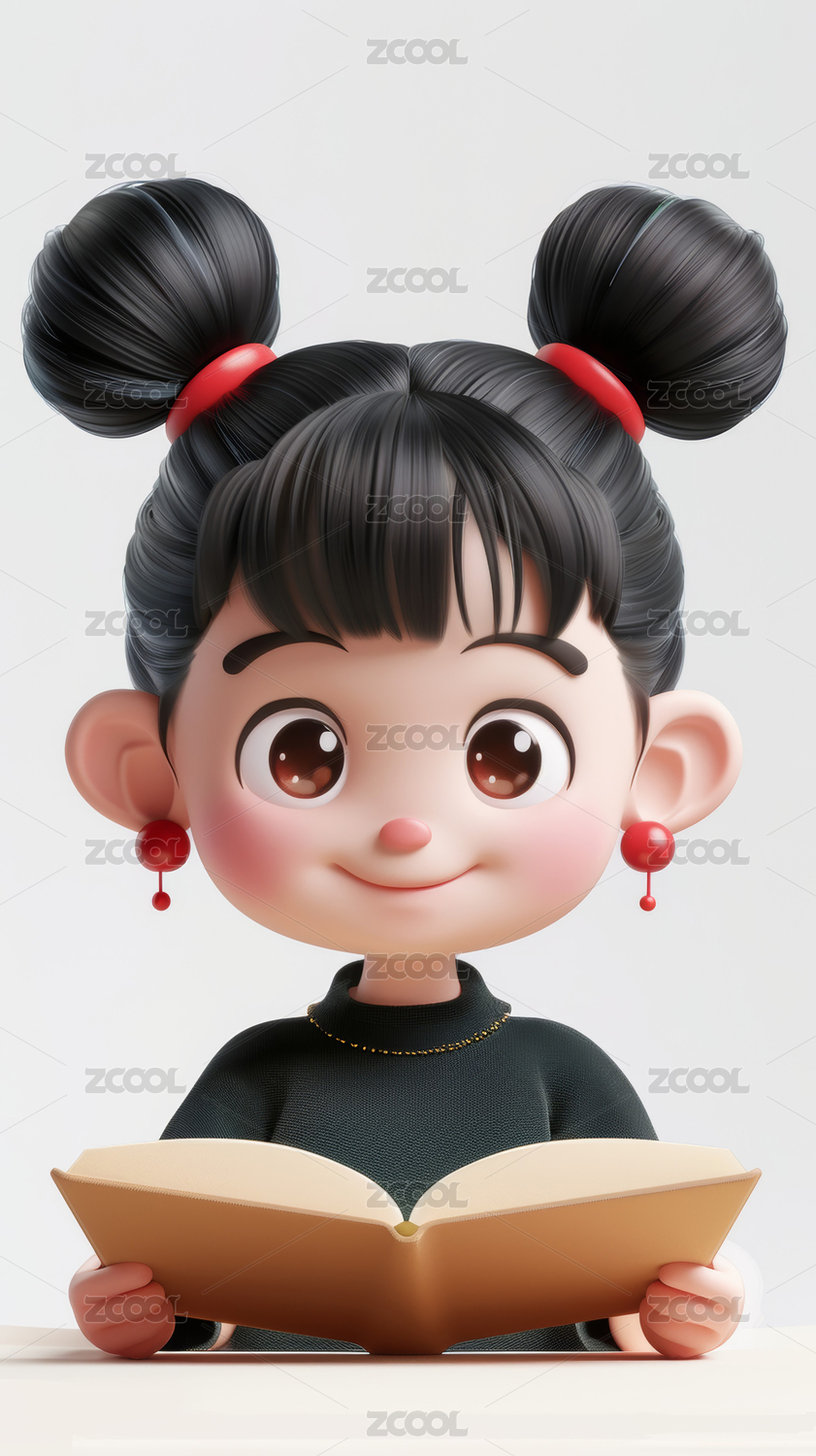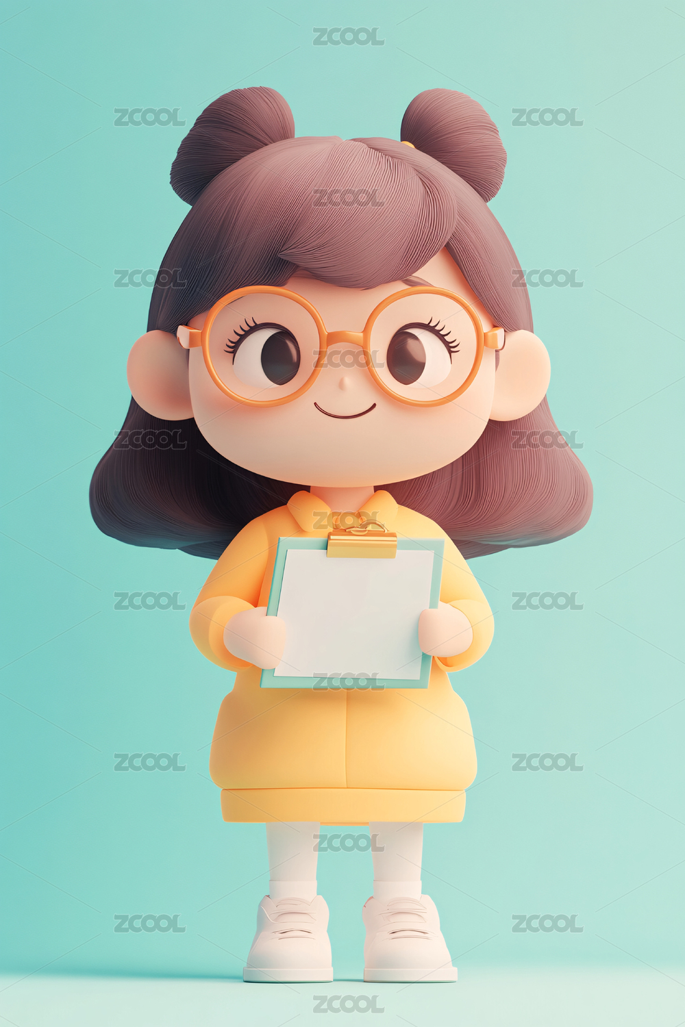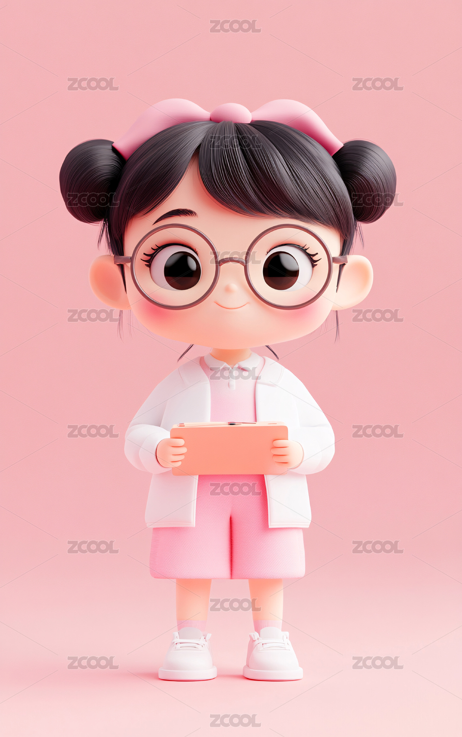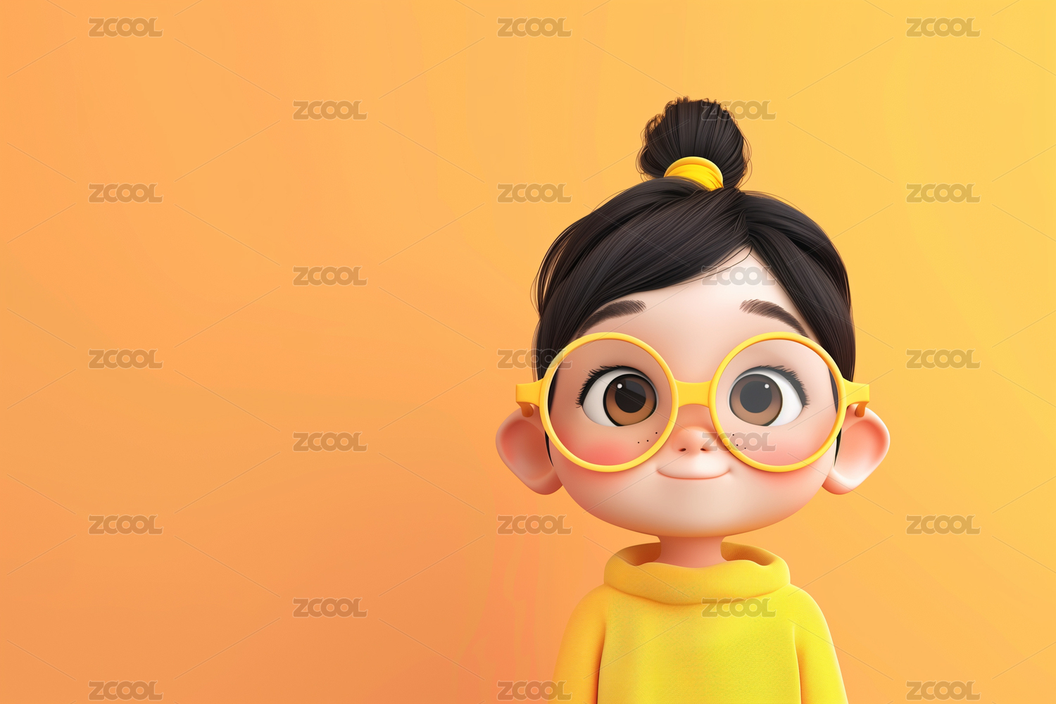 戴近视眼镜的小女孩儿童纯色背景3D卡通头