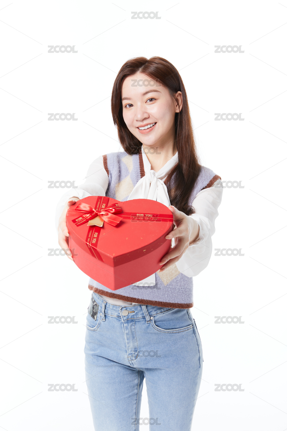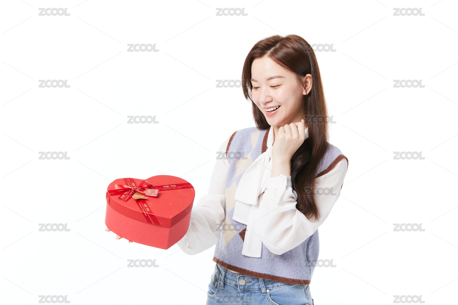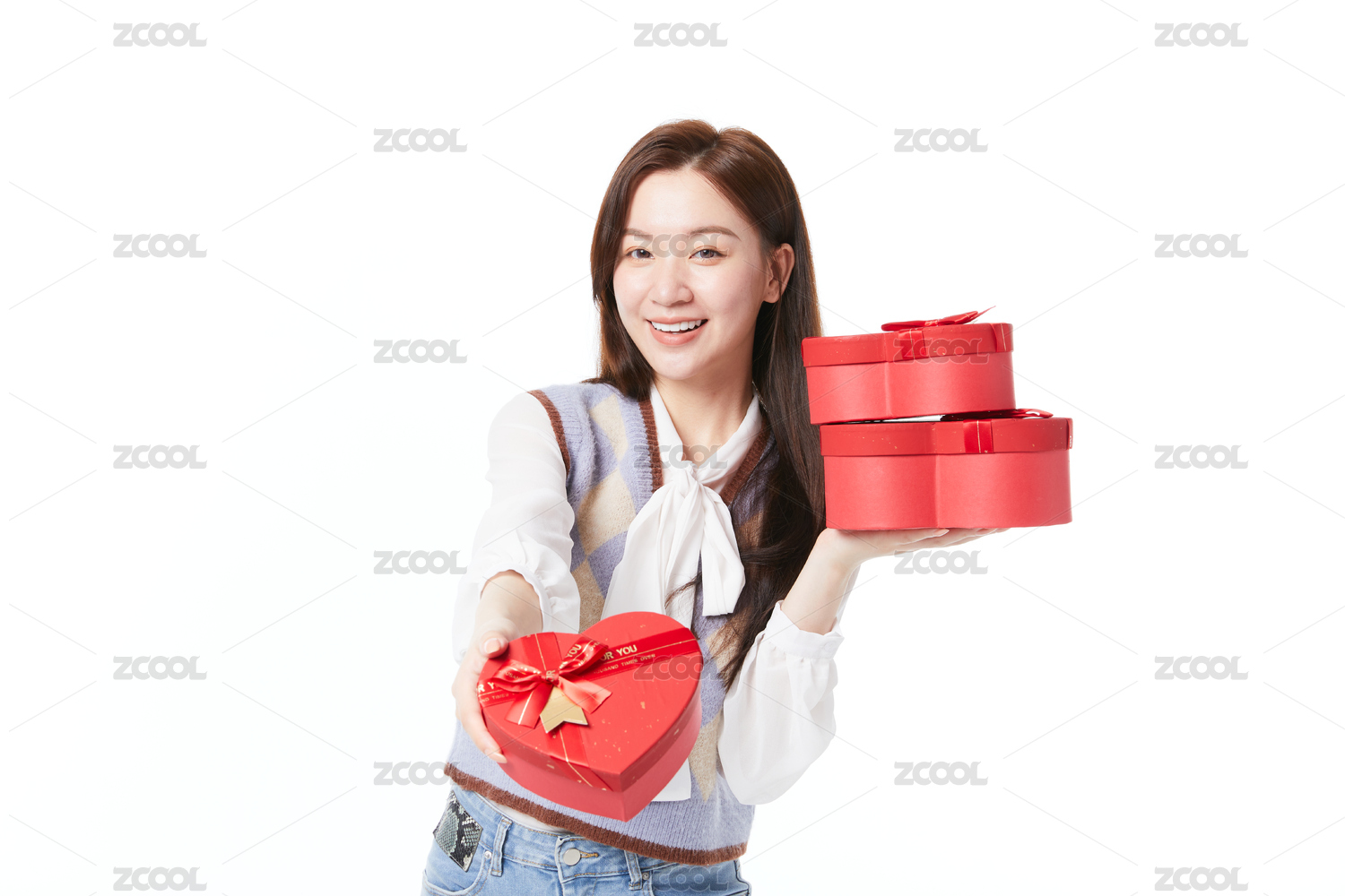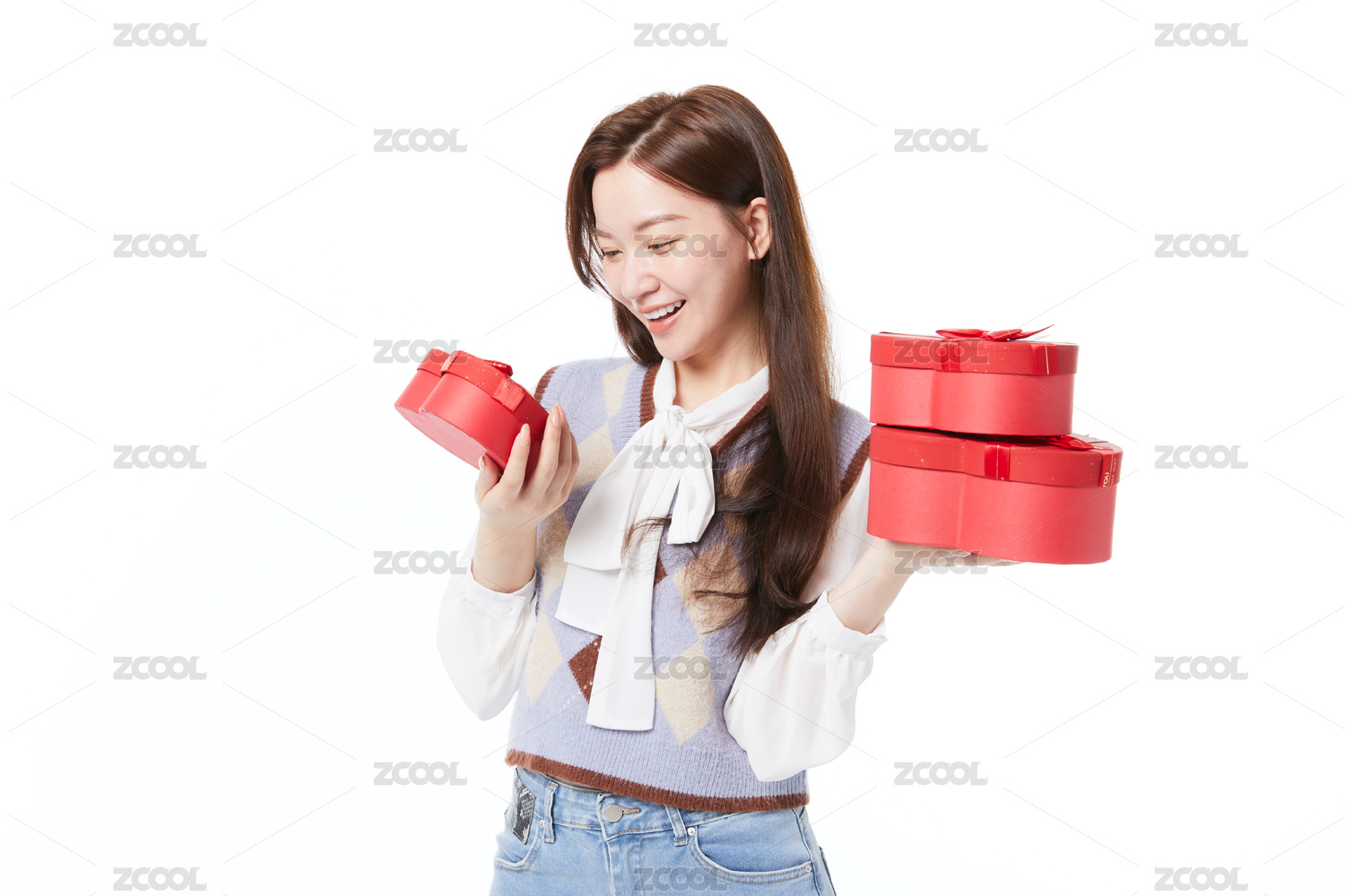 穿着红色喜庆毛衣的年轻女性拿着礼品盒