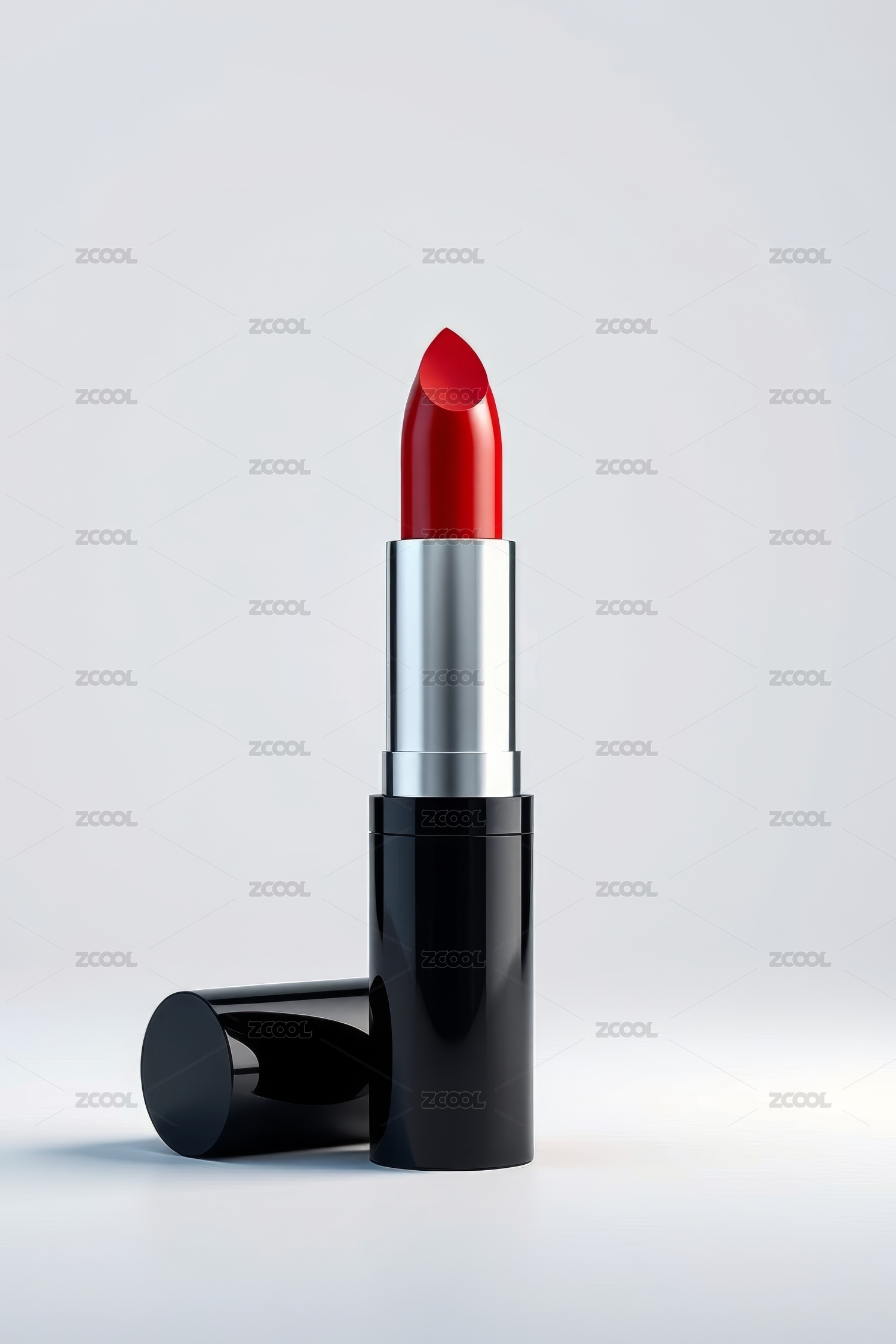 一支红色口红竖立在白色背景上