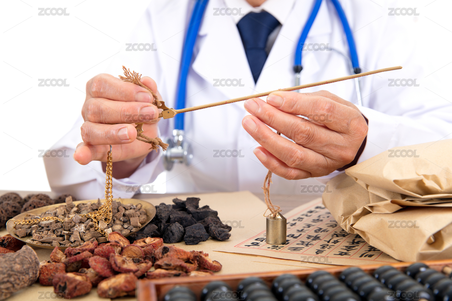 中医大夫手拿中药枫球子翻阅着医书典籍学习