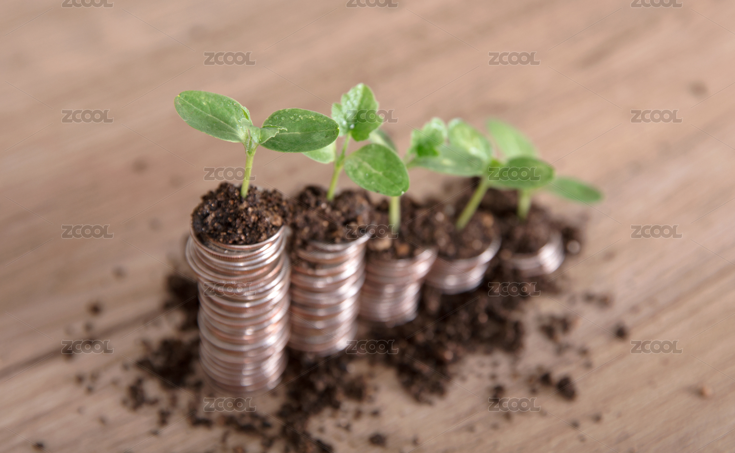 大自然的土壤里一摞美元硬币及硬币上长出的幼苗