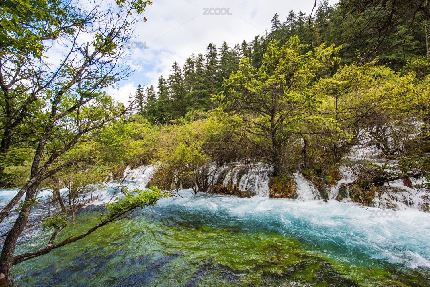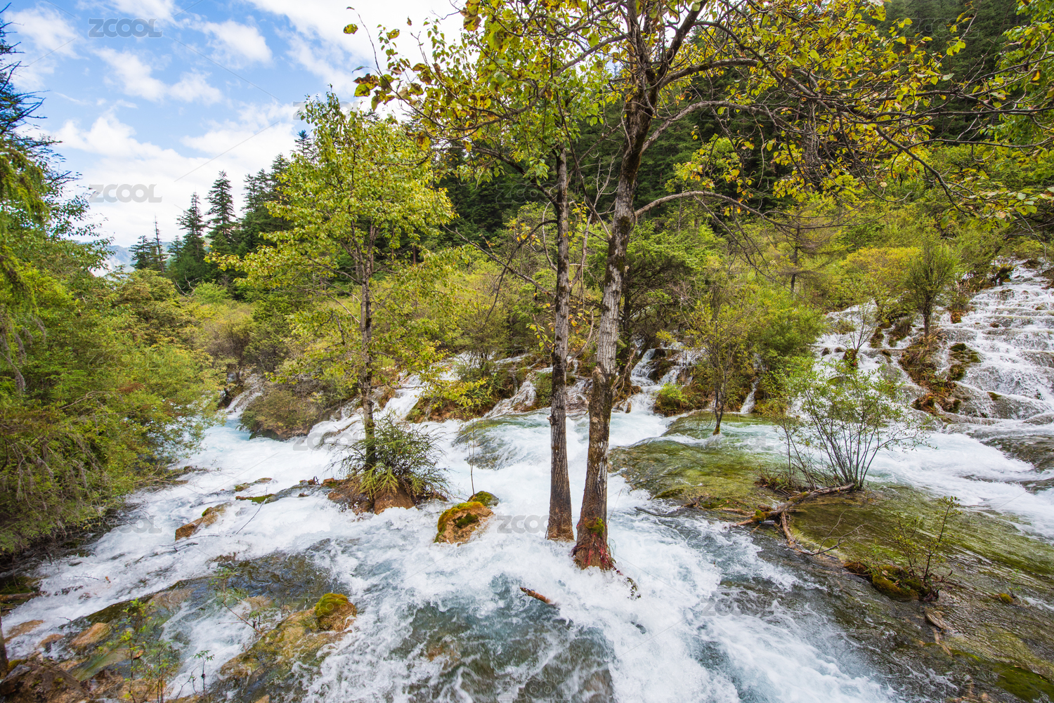 四川,九寨沟,瀑布,水流,白色,树木,晴天,白云,钙华,落差