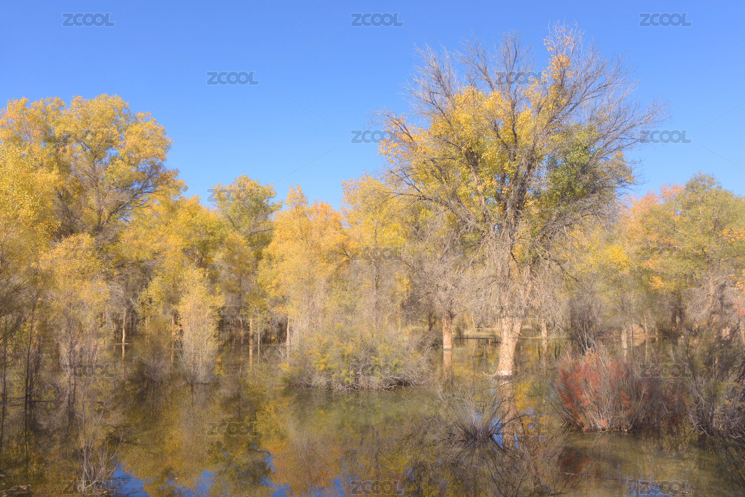 中国甘肃金塔胡杨林金波湖景区水中金色胡杨