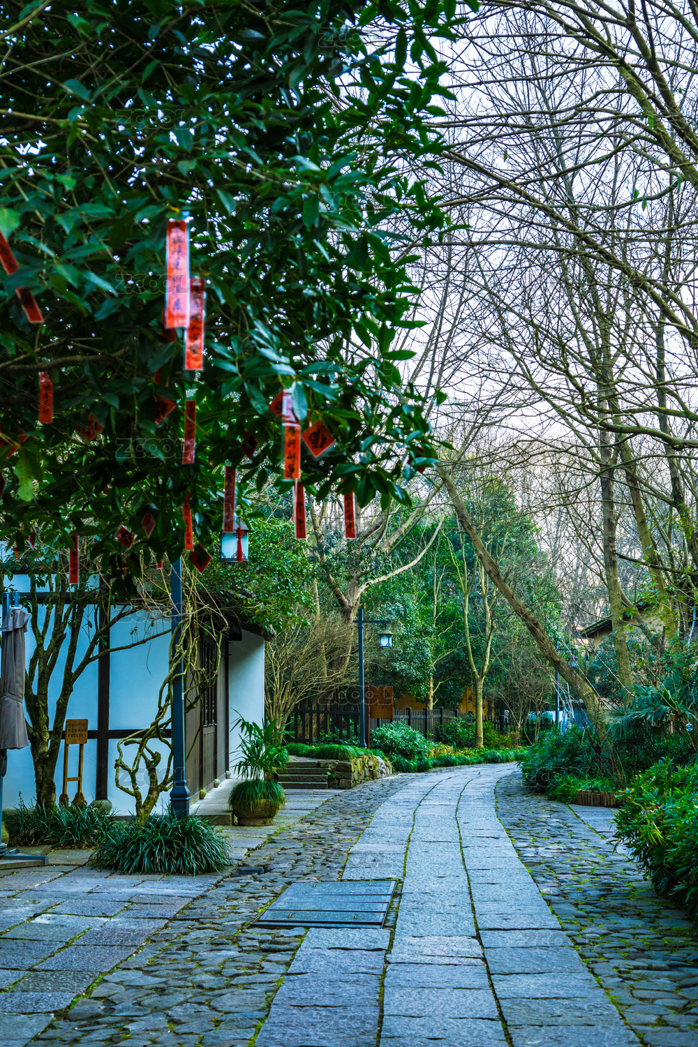节日中中国江南老街的古建筑与树梢上的灯笼