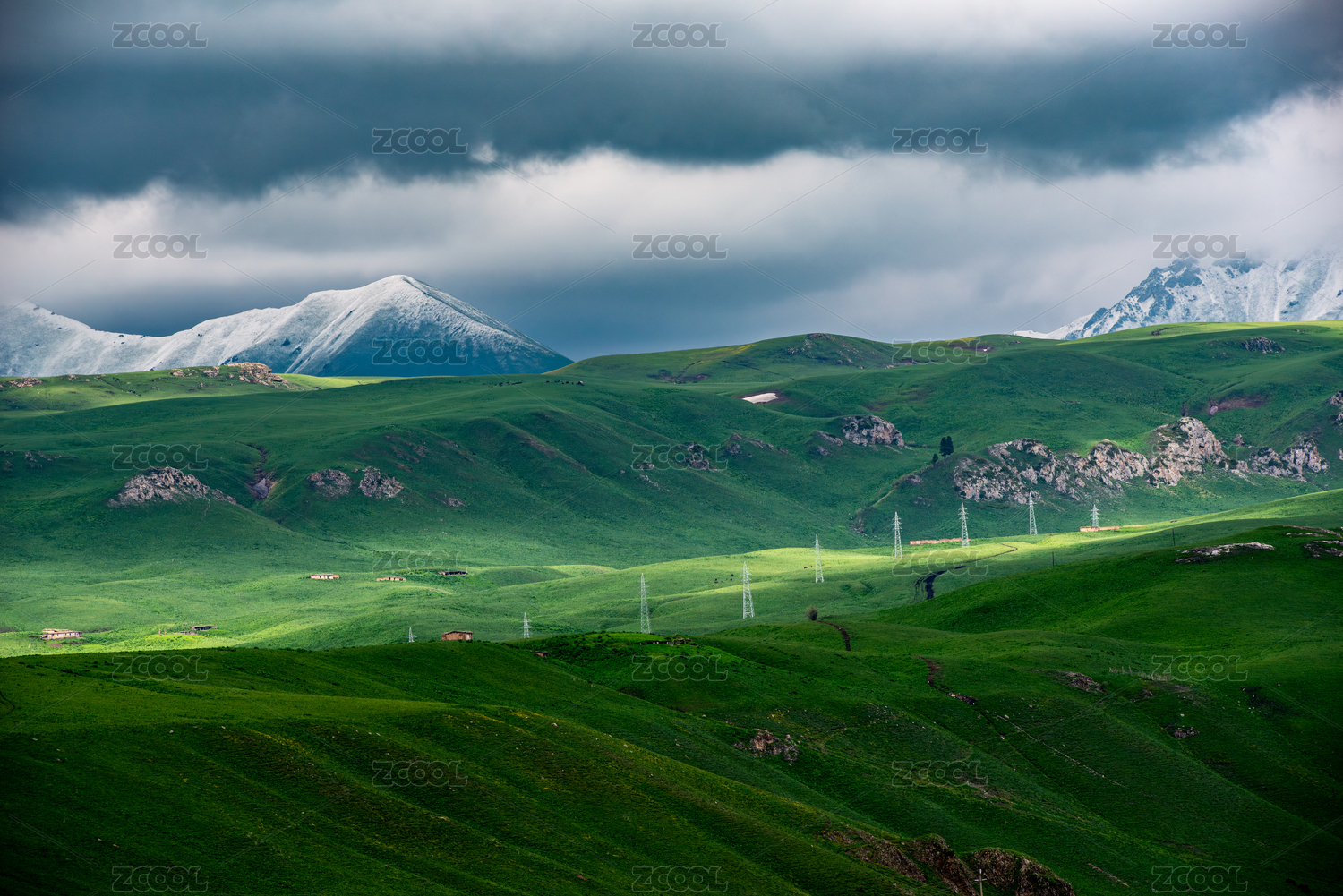 中国新疆巴音布鲁克山坡上的输电塔与雪峰