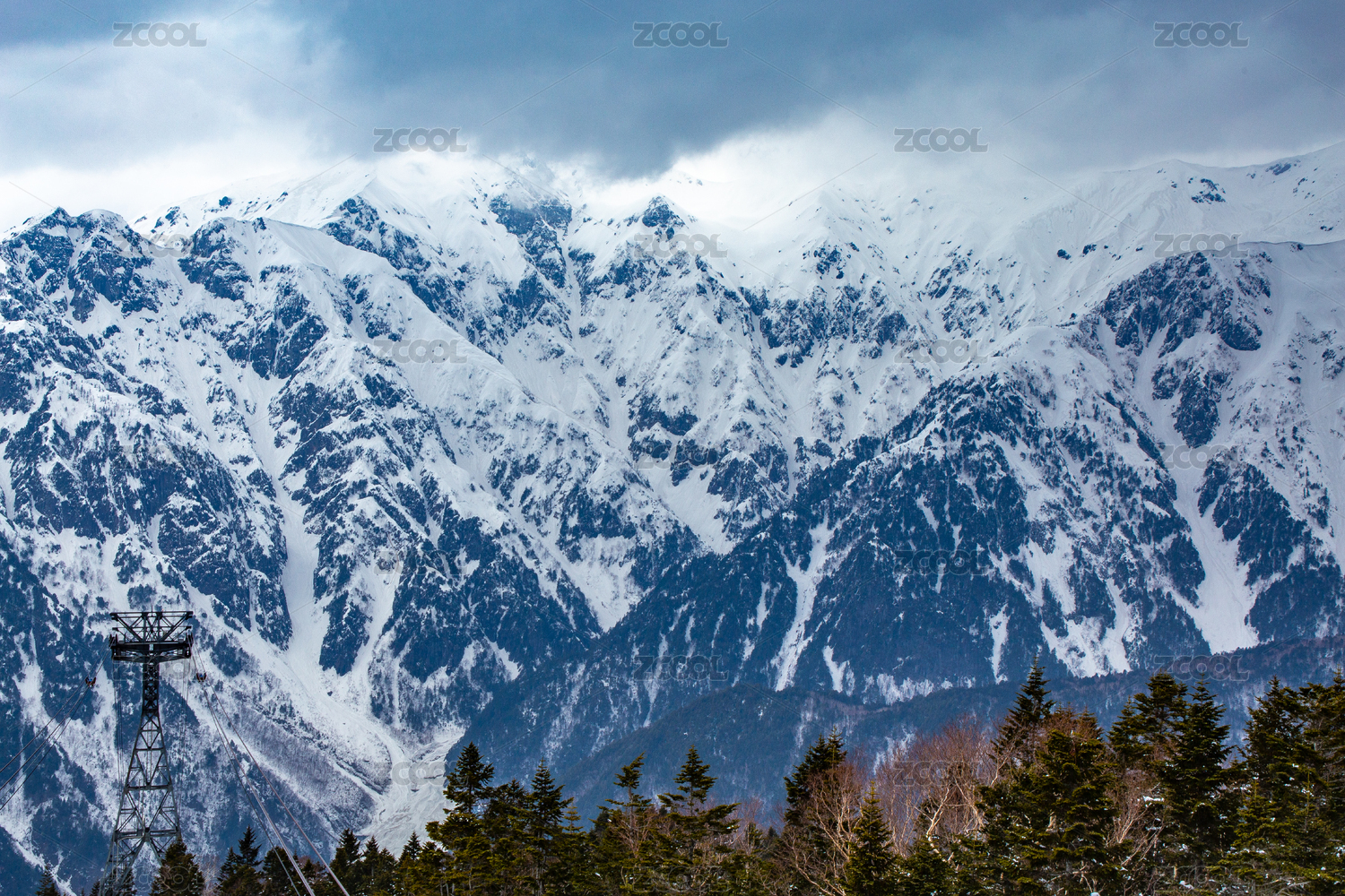 日本岐阜县新穗高,阴天的笠岳雪山与松树林、缆车架