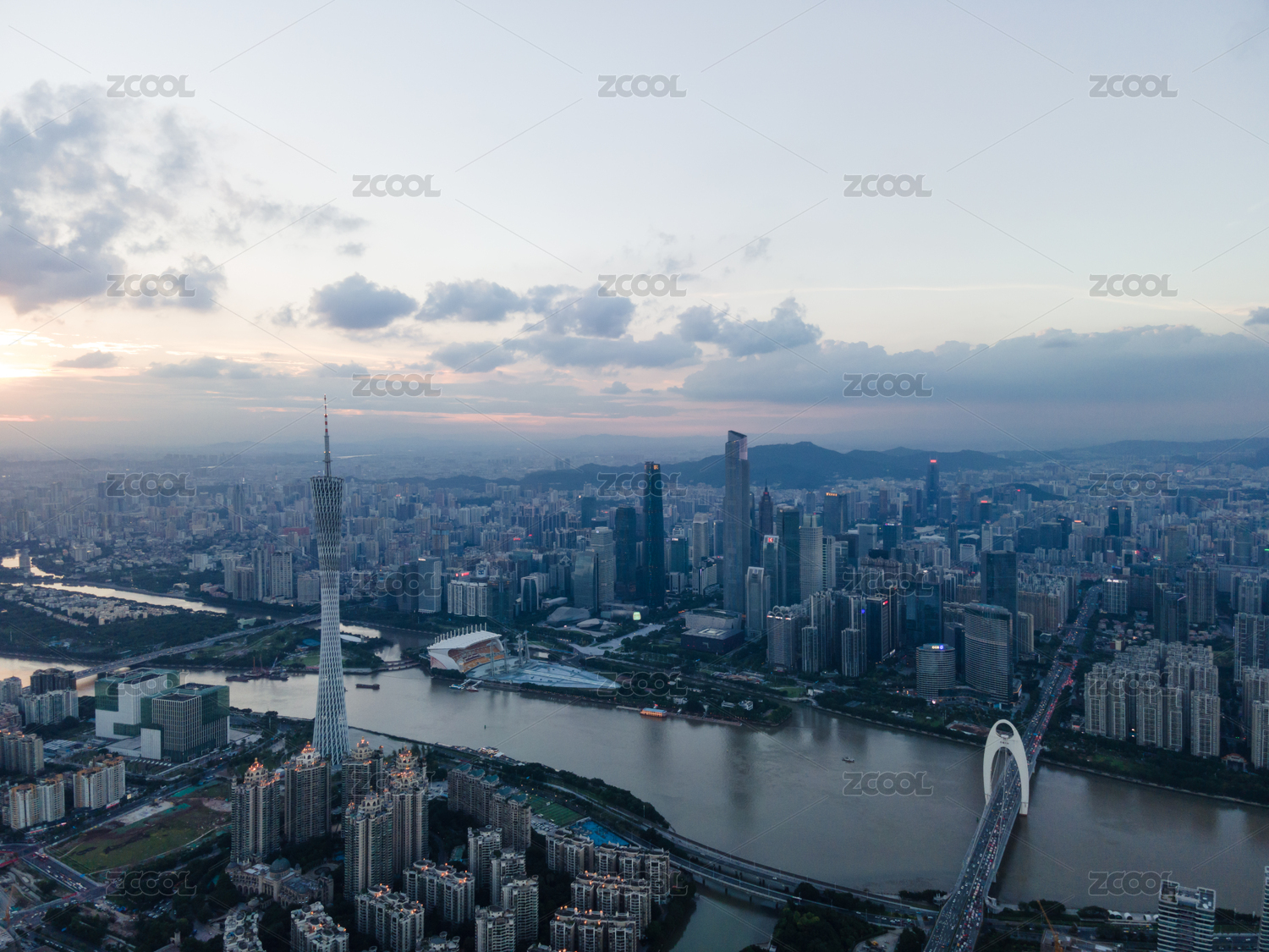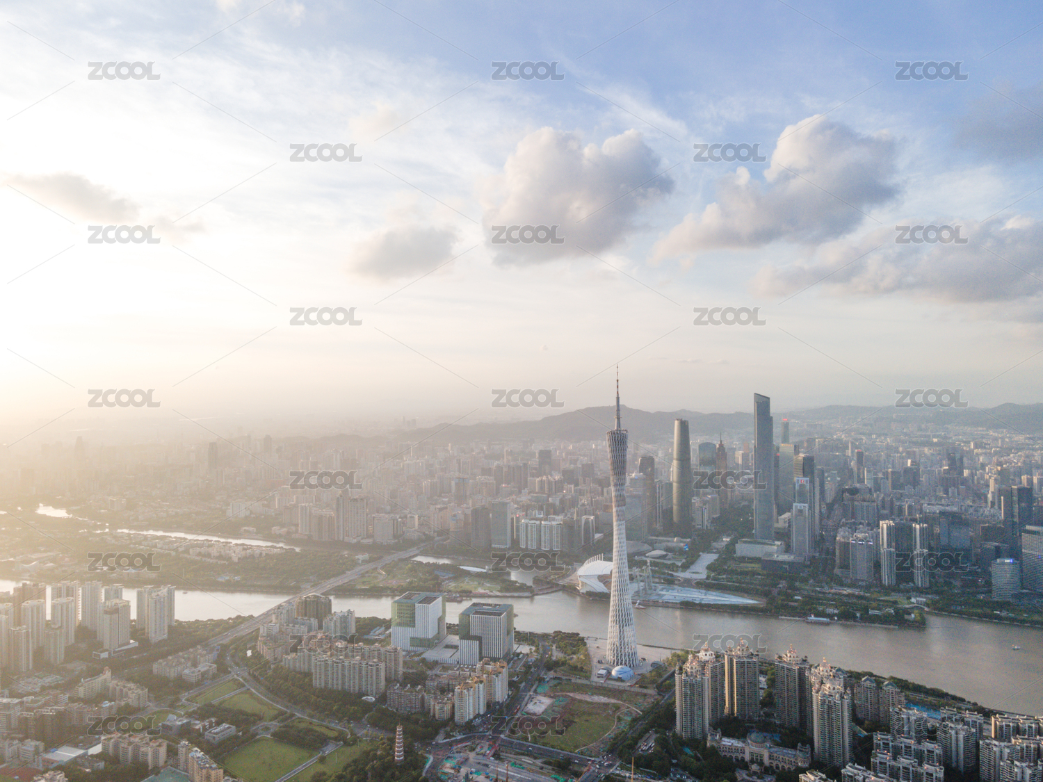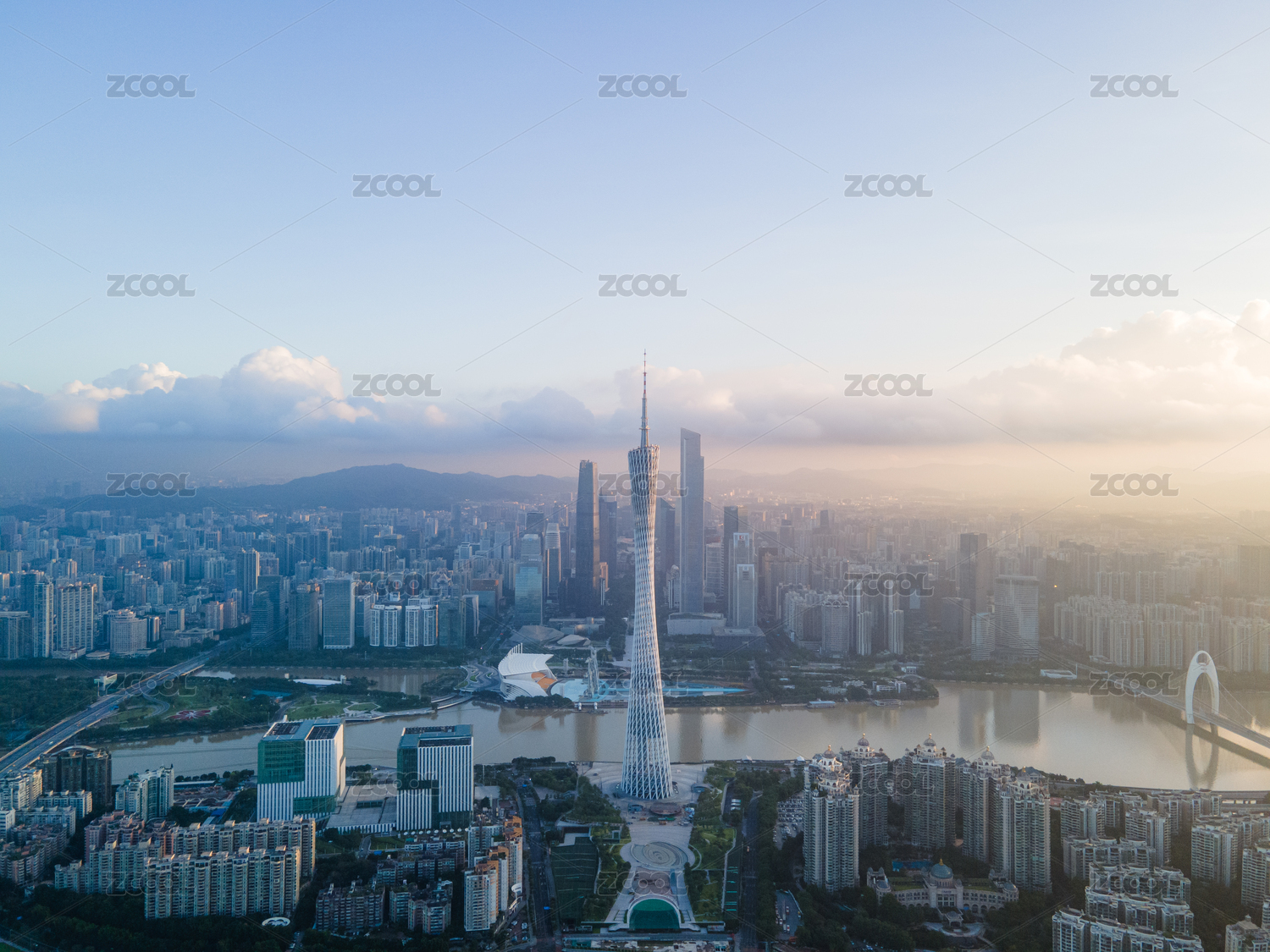 中国广东广州塔和珠江新城城市天际线日出风光航拍