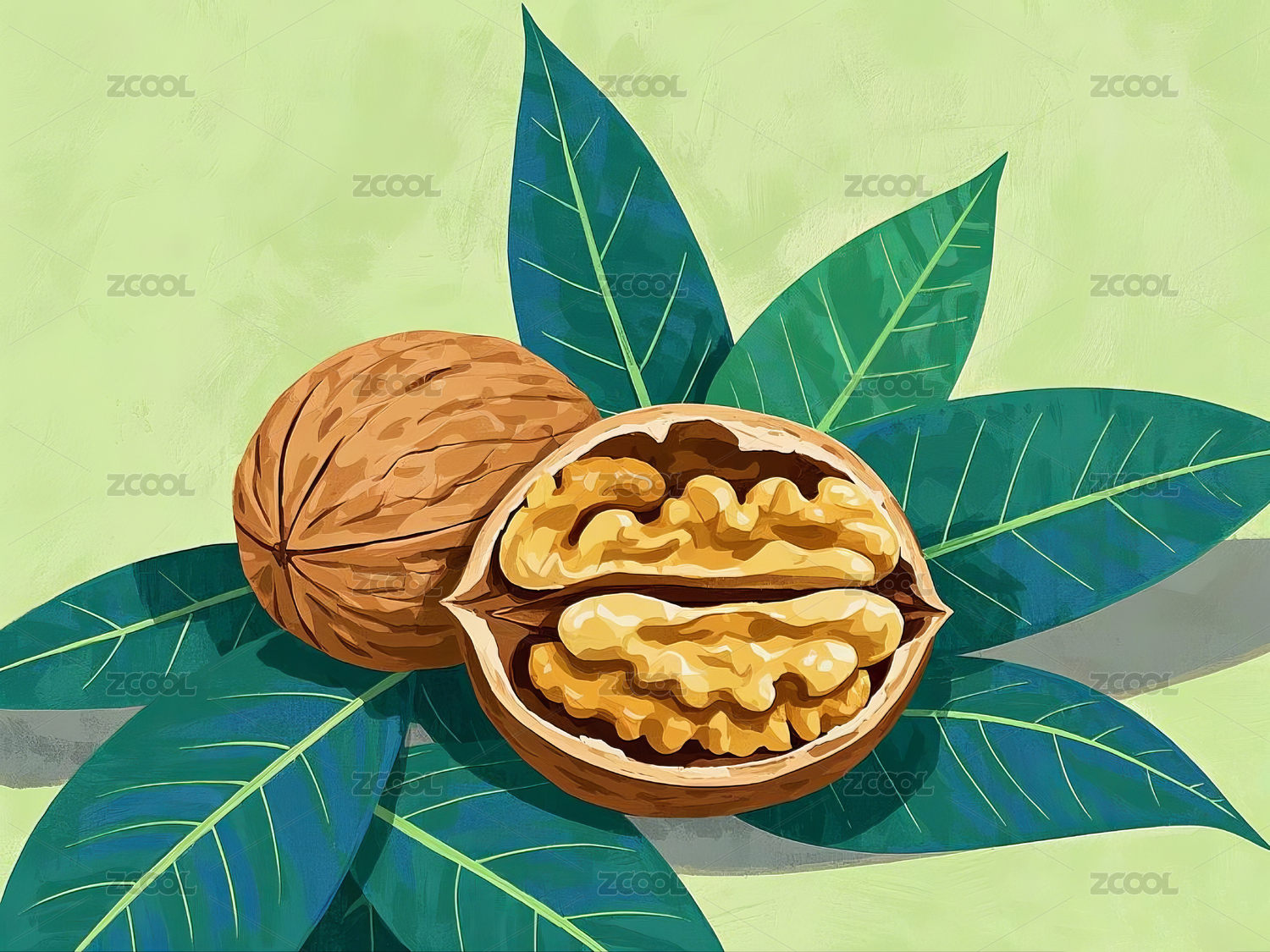 核桃坚果叶子写实插画