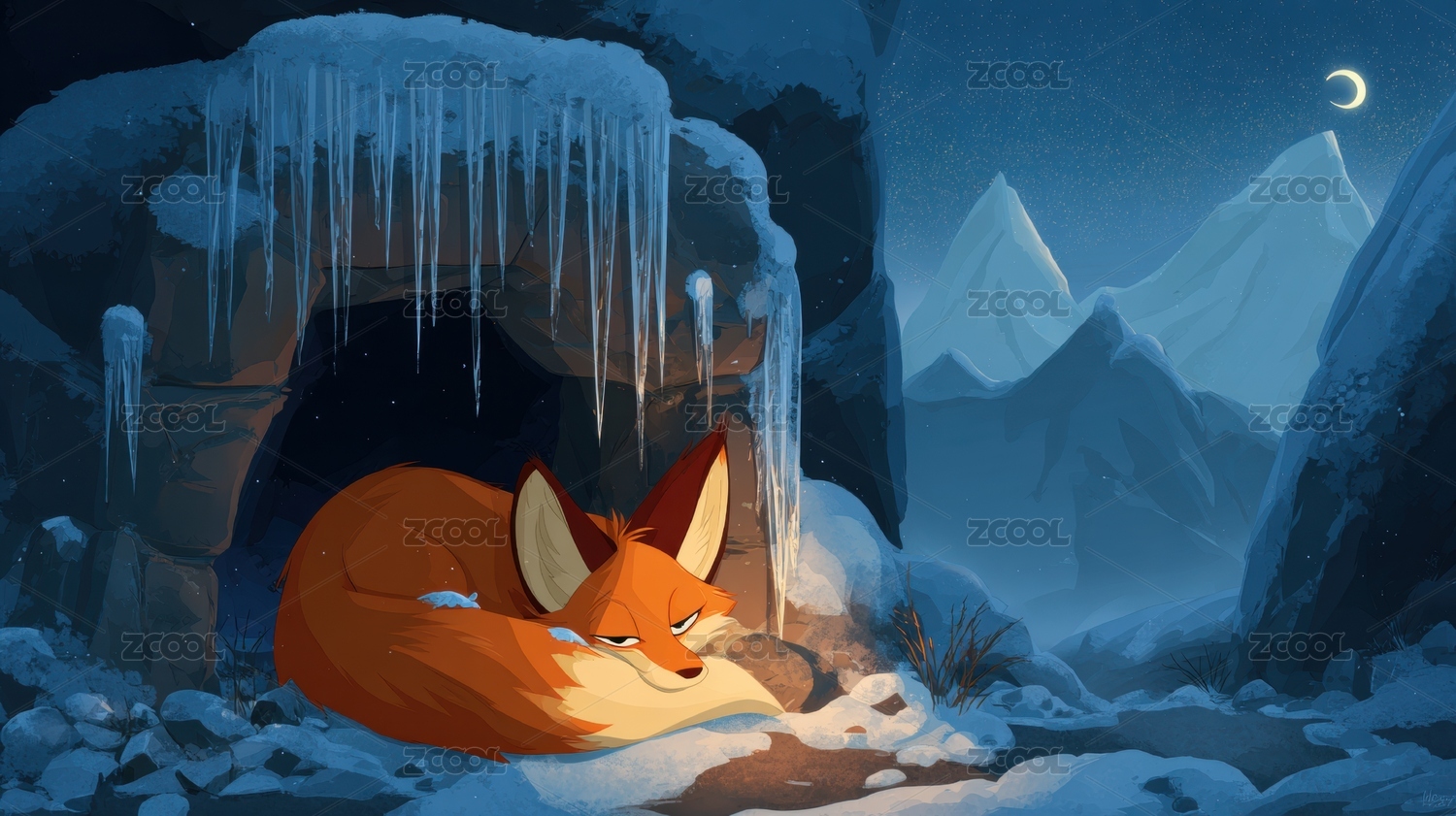 夜晚小男孩躺在大狐狸身上睡觉扁平插画