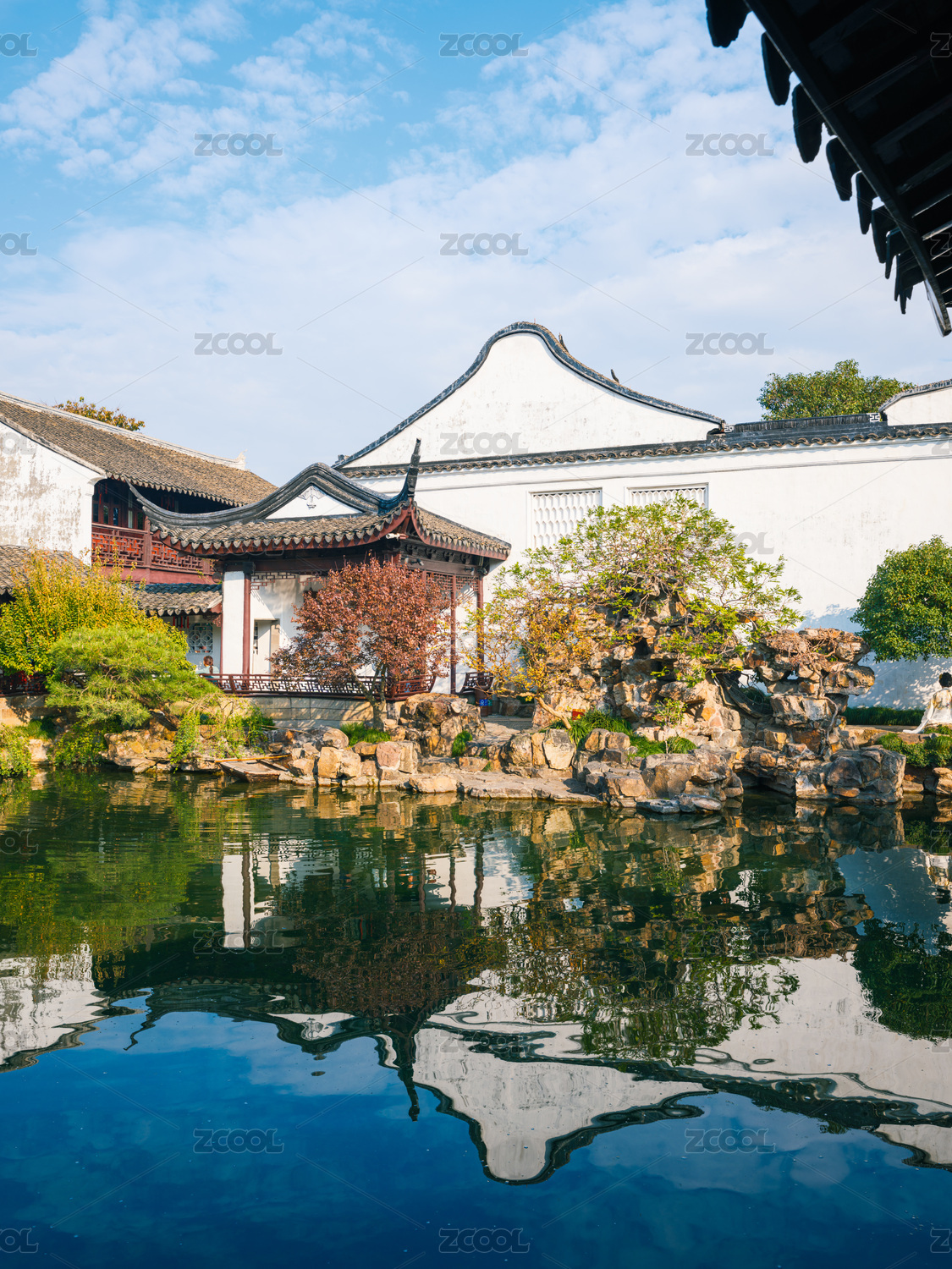 深秋时节苏州网师园亭台楼阁和池塘倒影