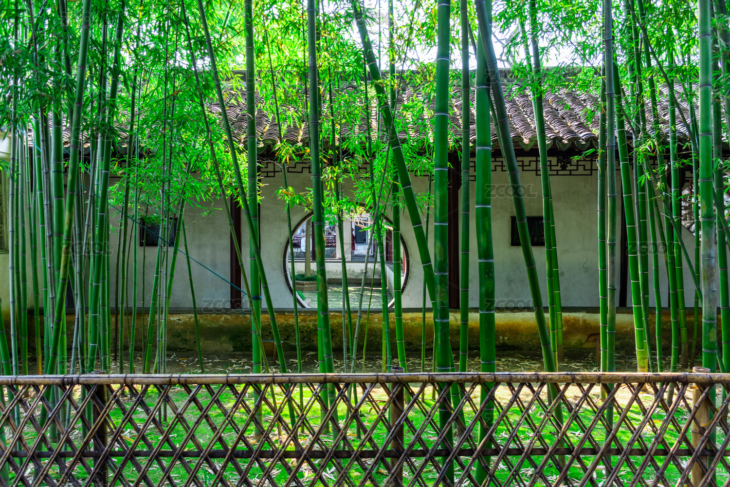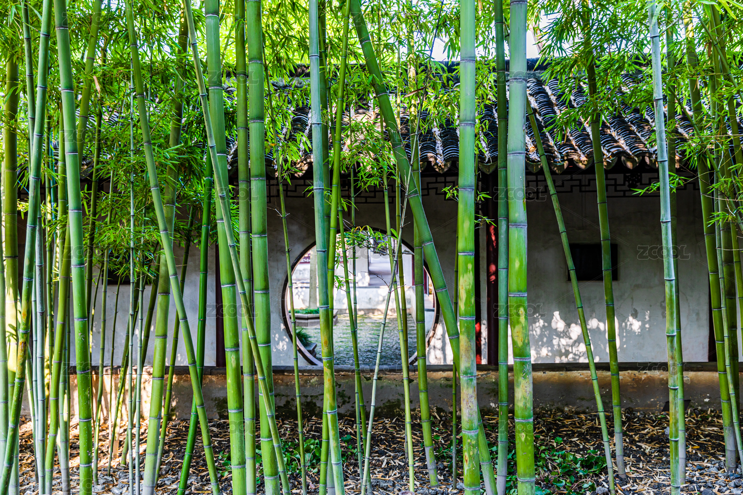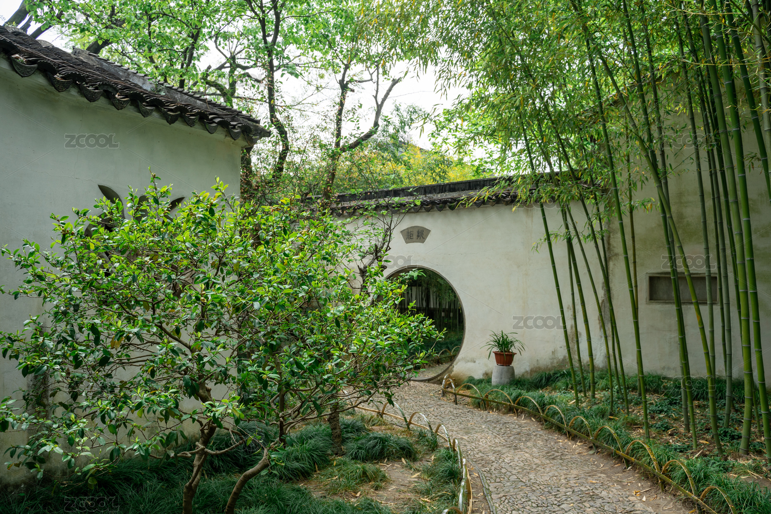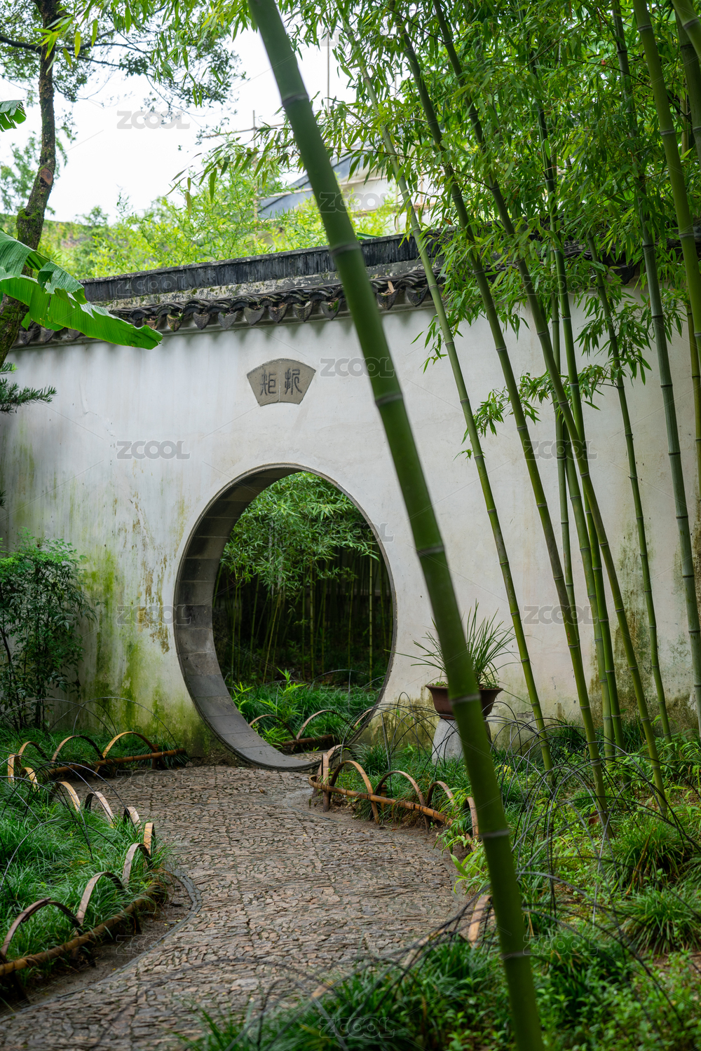 中国苏州园林的月洞门与绿树
