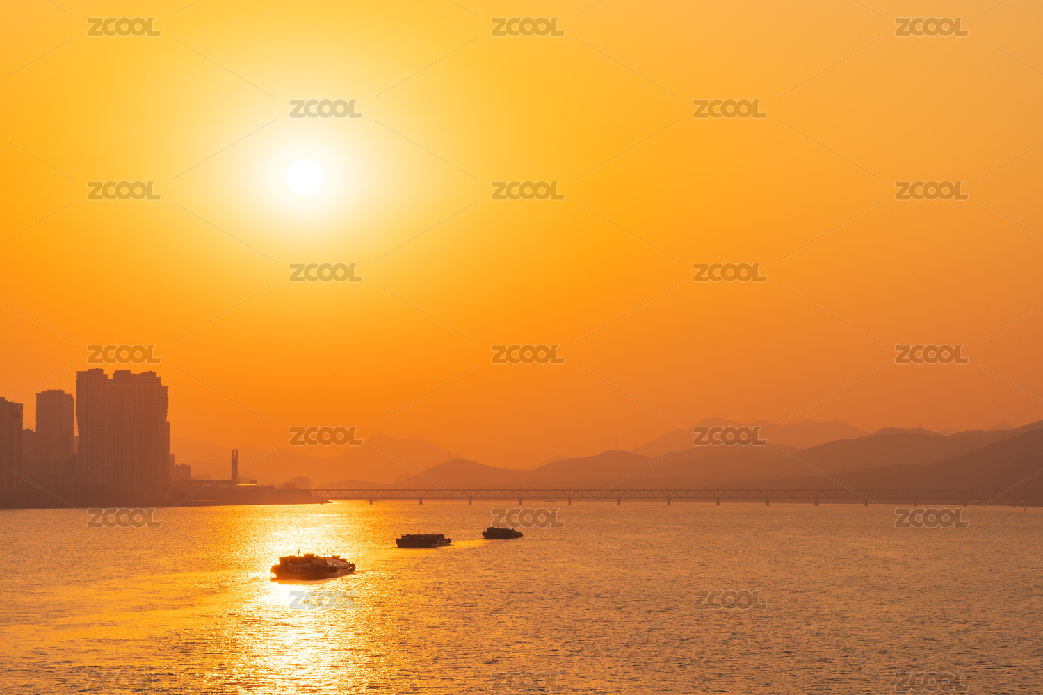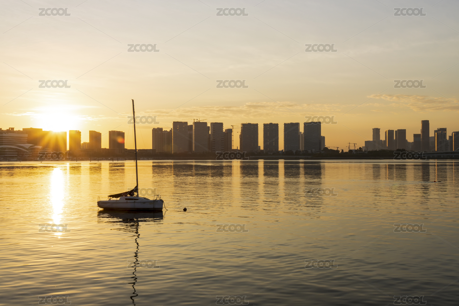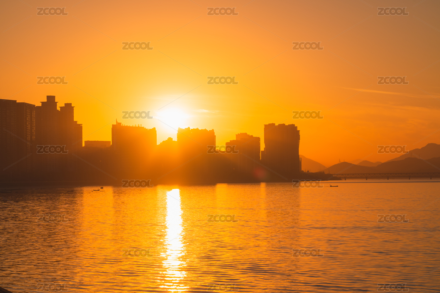 落日黄昏日柱天象下的杭州之江版块城市建筑
