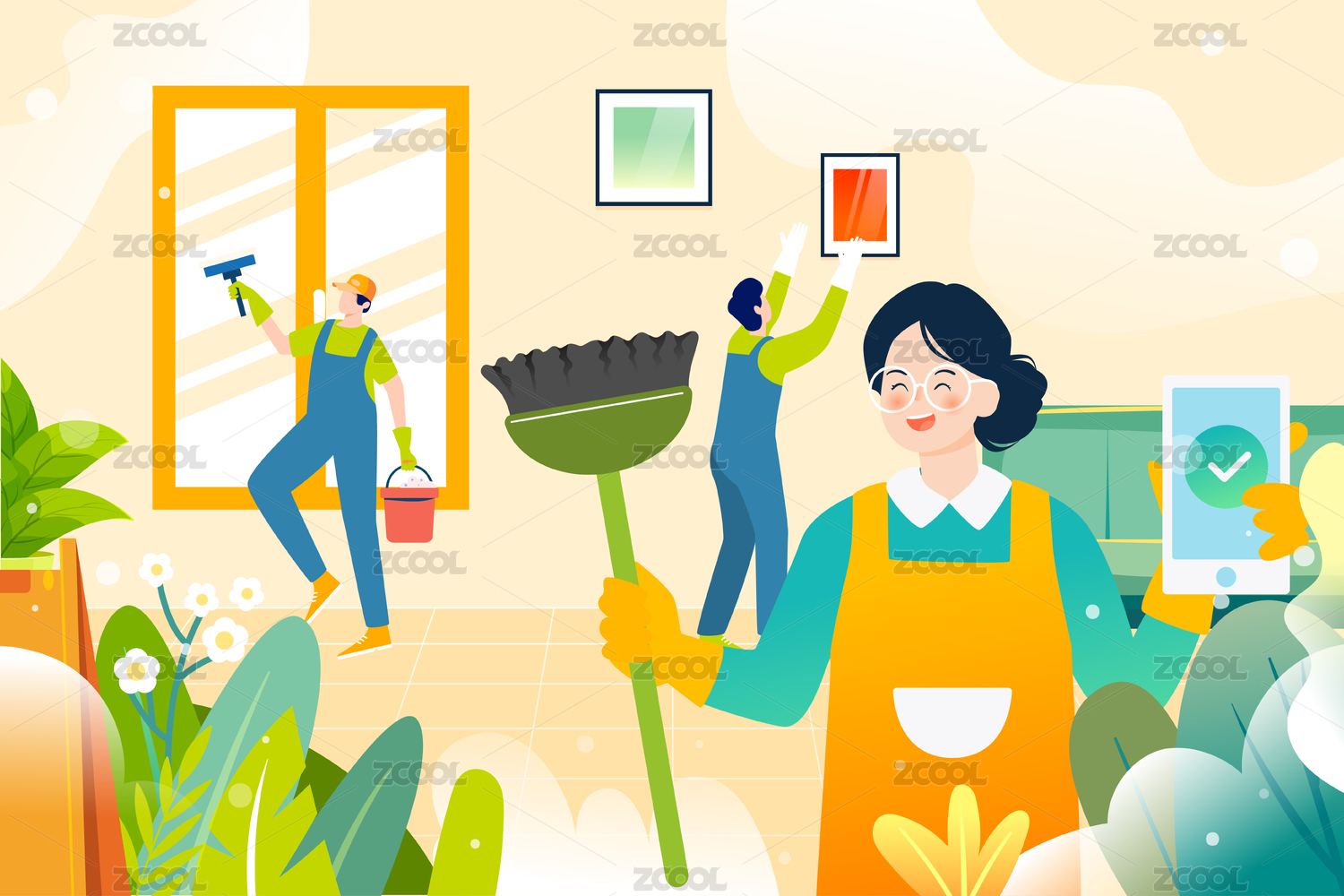 家政保洁劳动节人物大扫除打扫地板节日插画