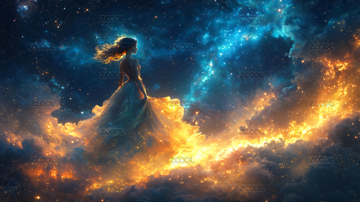彩云玄幻飞翔人物飞鸟艺术插画背景
