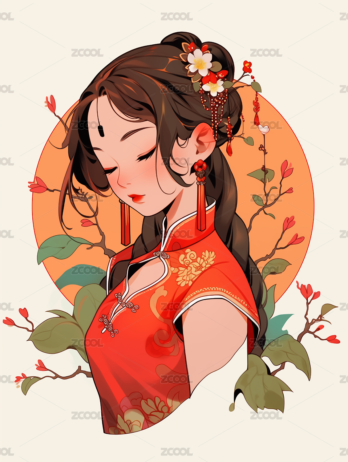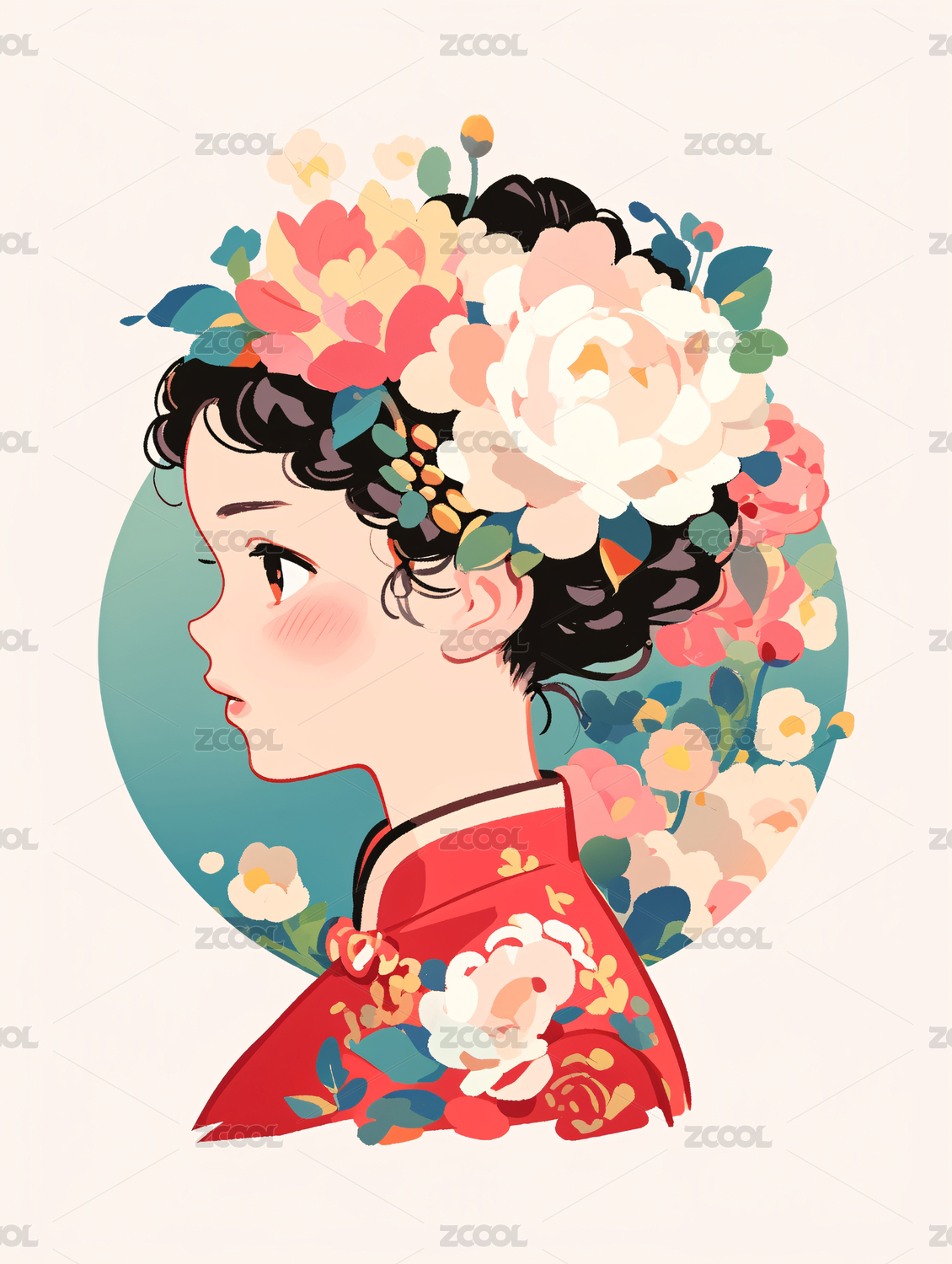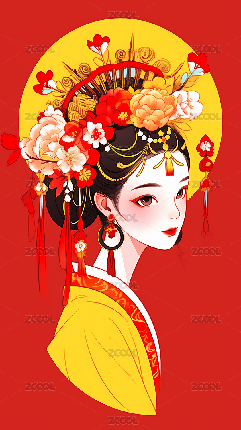 古风美女的节日卡通肖像插画