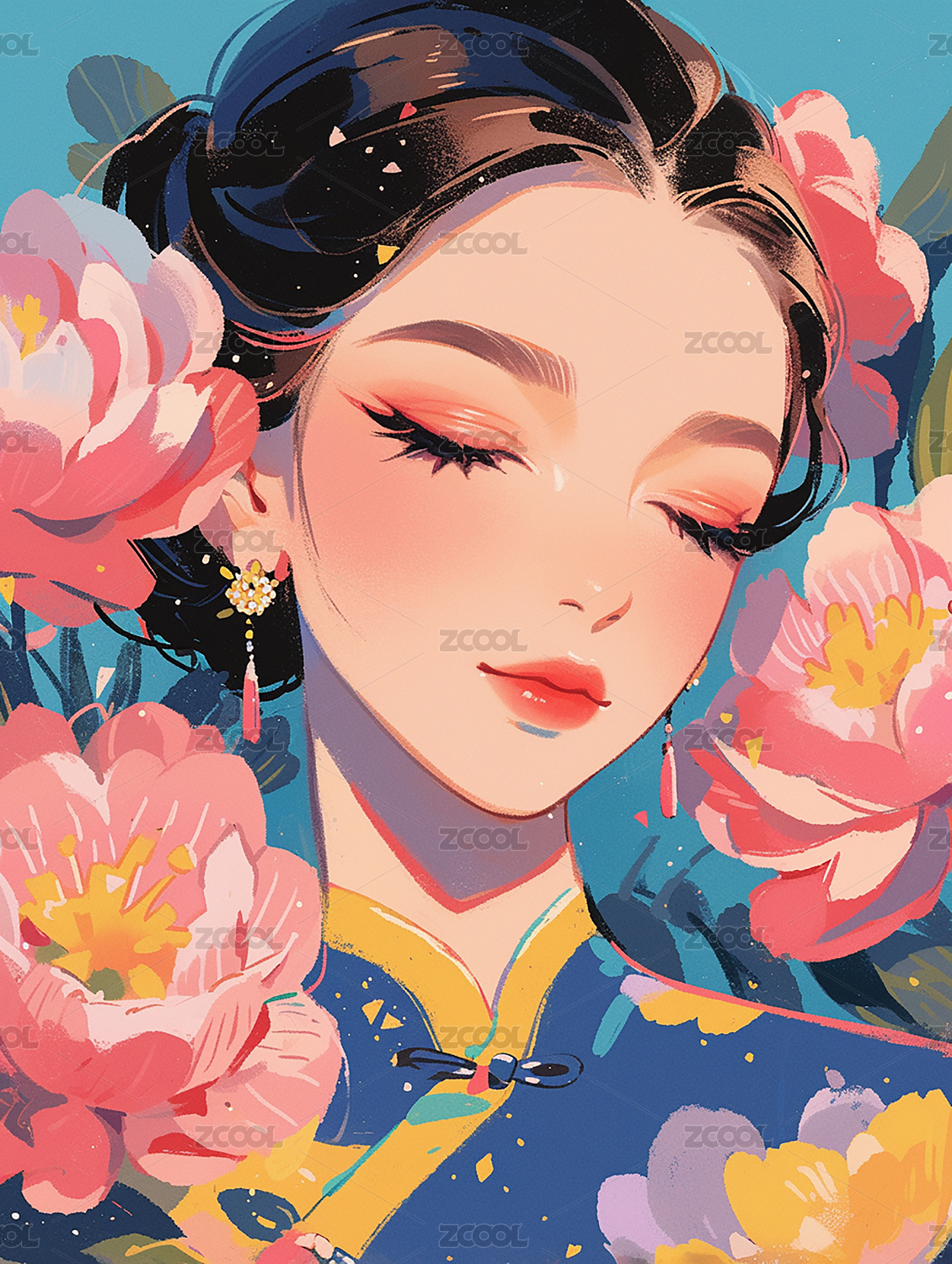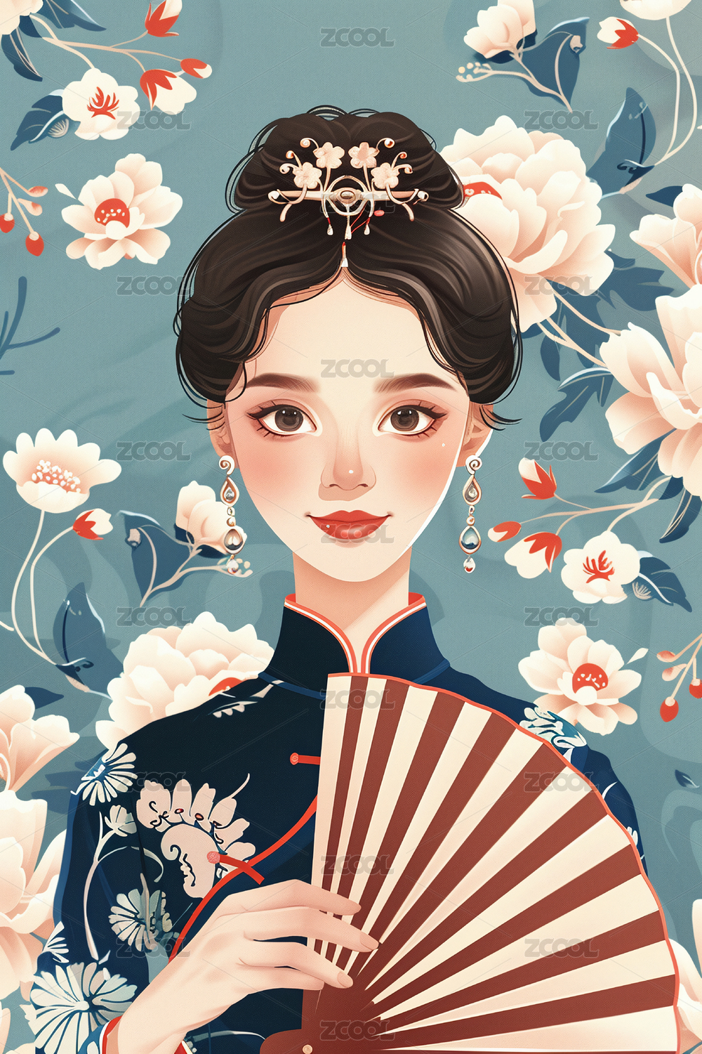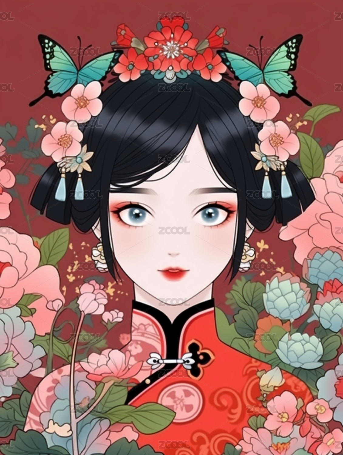 古风美女的节日卡通肖像插画