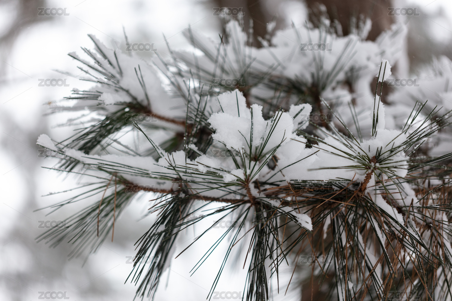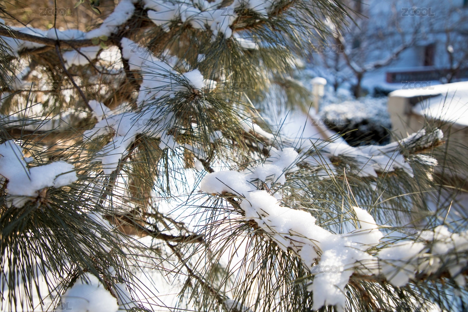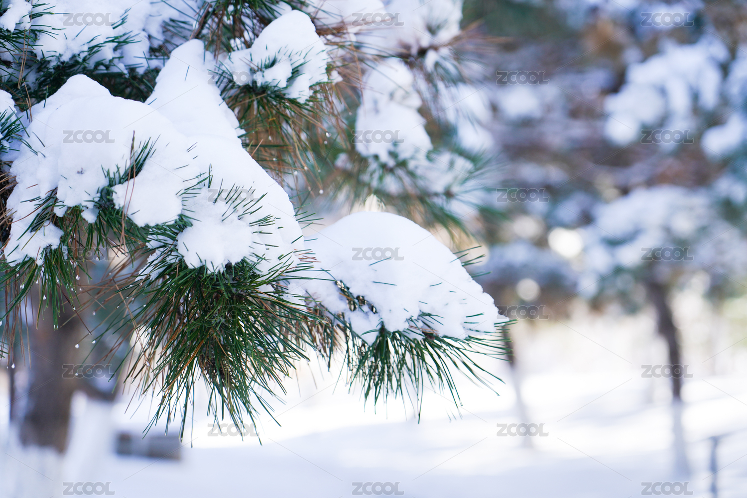 白雪压在青松枝条上