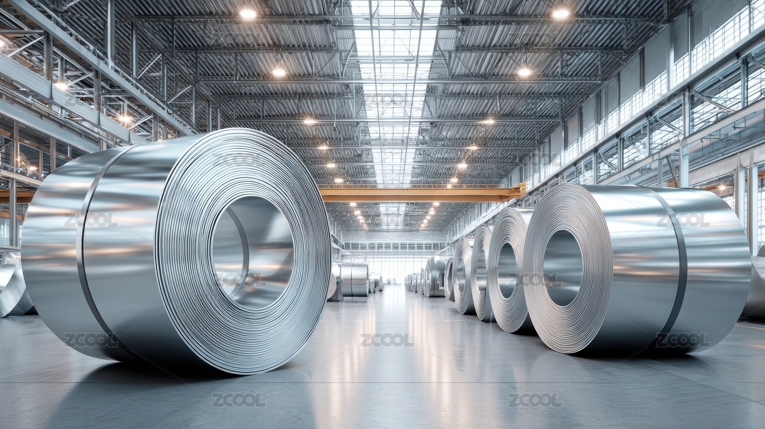 明亮先进的的现代工厂库房内整齐排列着钢卷