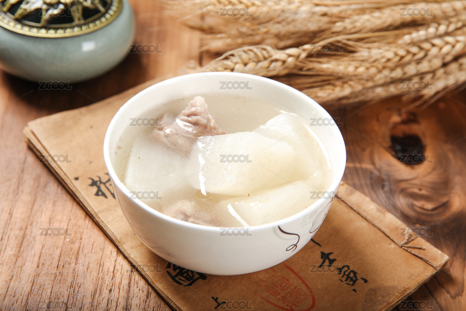 中式托盘上的猪肉排骨瓦罐煨汤