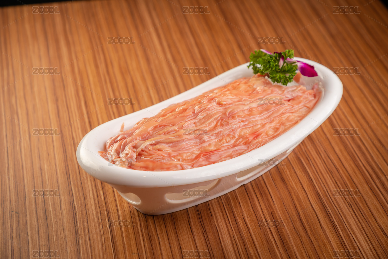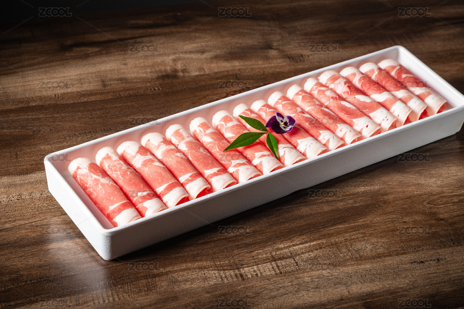 白盘里的重庆老火锅菜品生切冰鲜猪颈肉片