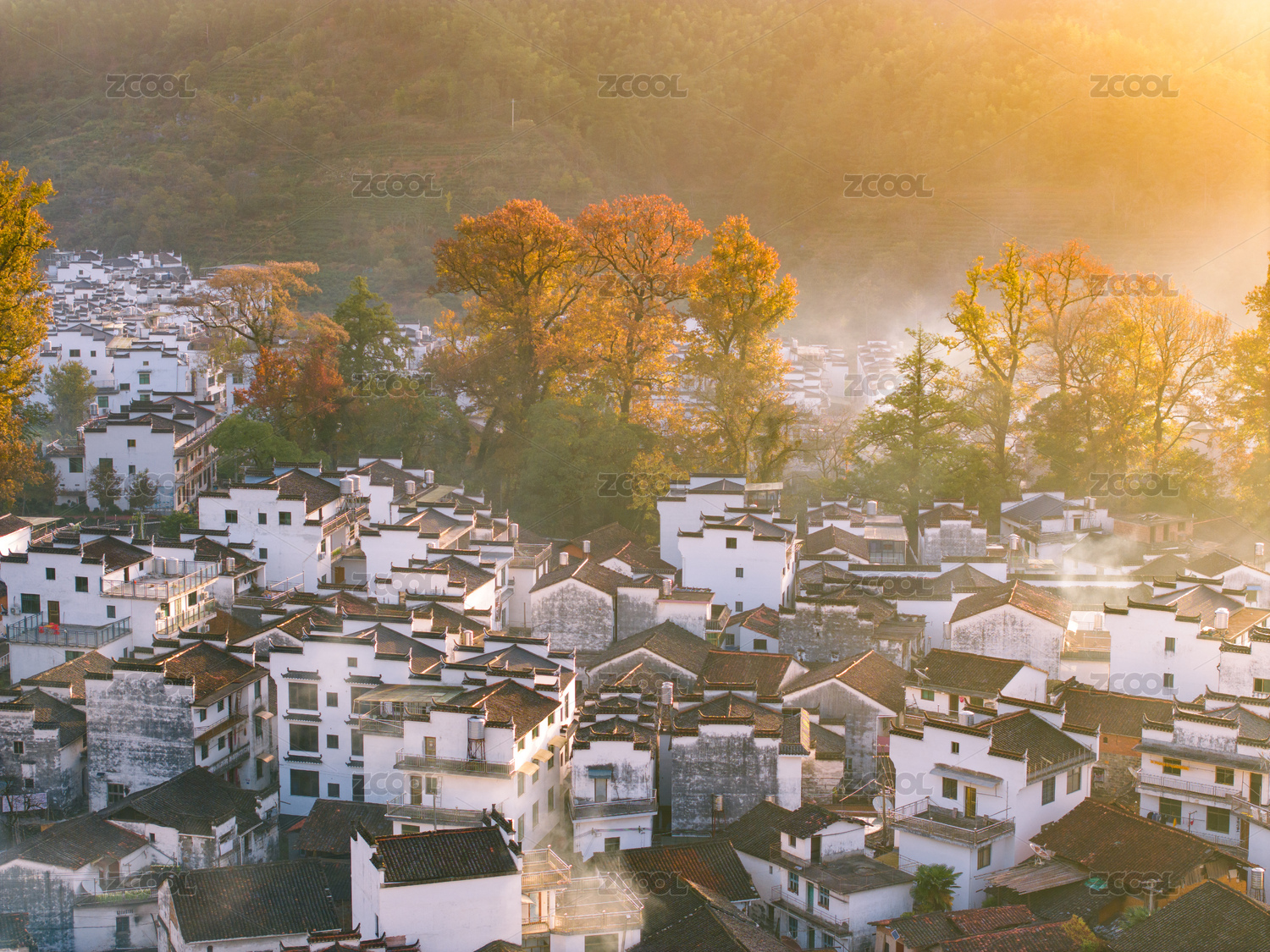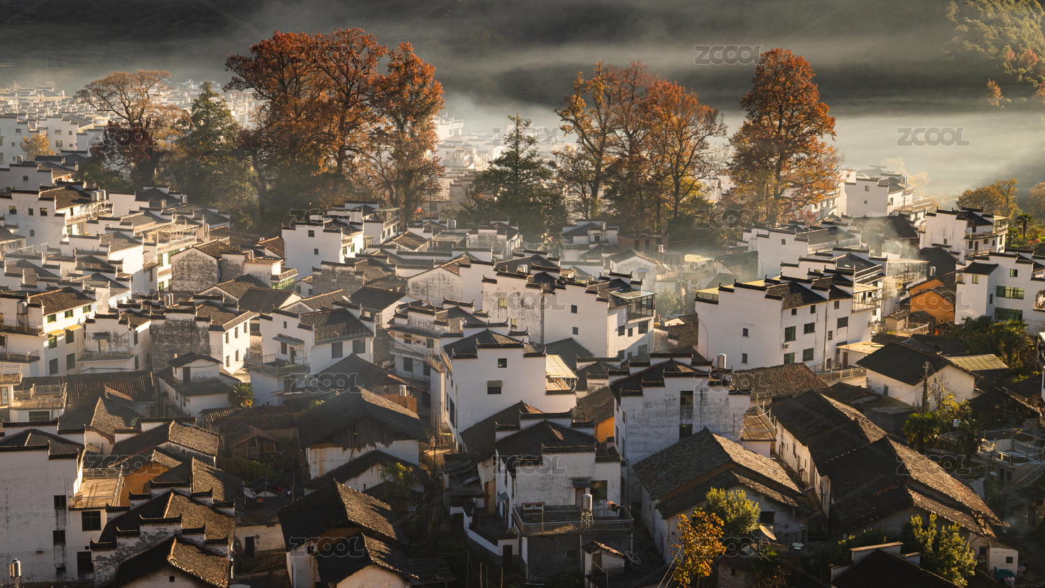 航拍江西婺源石城徽派建筑秋色枫叶村庄日出