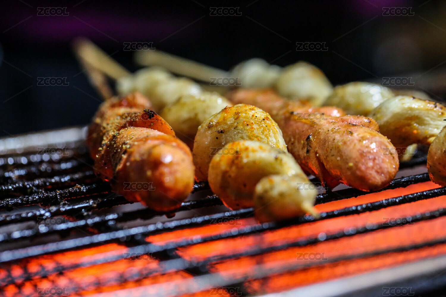 烧烤美食烤串:火腿肠、玉米、烤肉