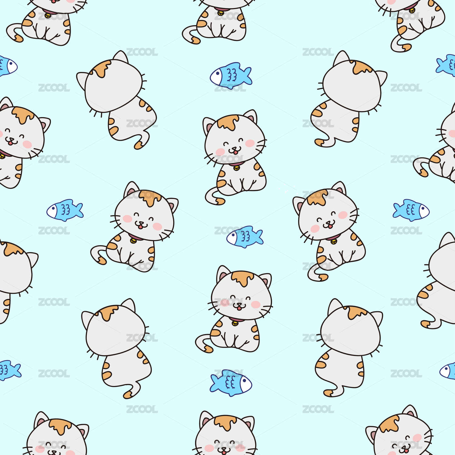 可爱卡通小猫吃鱼儿童无缝四方连续背景