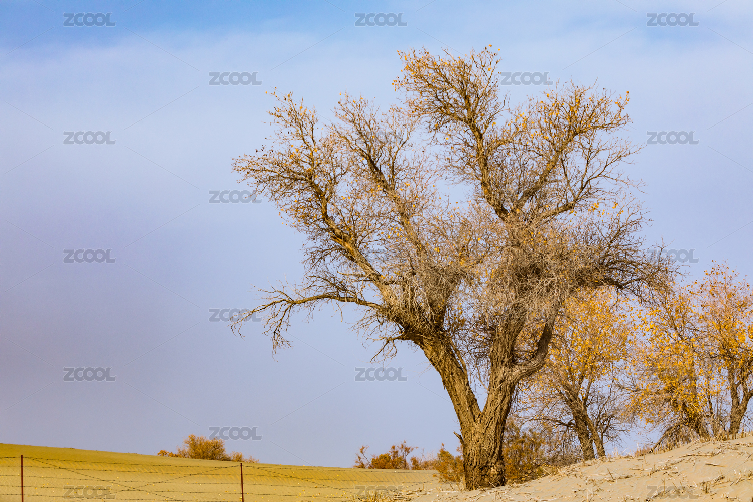 中国新疆南疆塔克拉玛干流动沙漠中金黄色的胡杨树