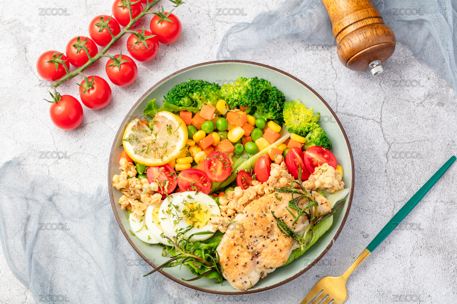 沙拉,轻食,减脂餐,水果沙拉,蔬菜沙拉,鸡胸肉,煎鸡胸肉,小番茄,玉米粒,鸡柳