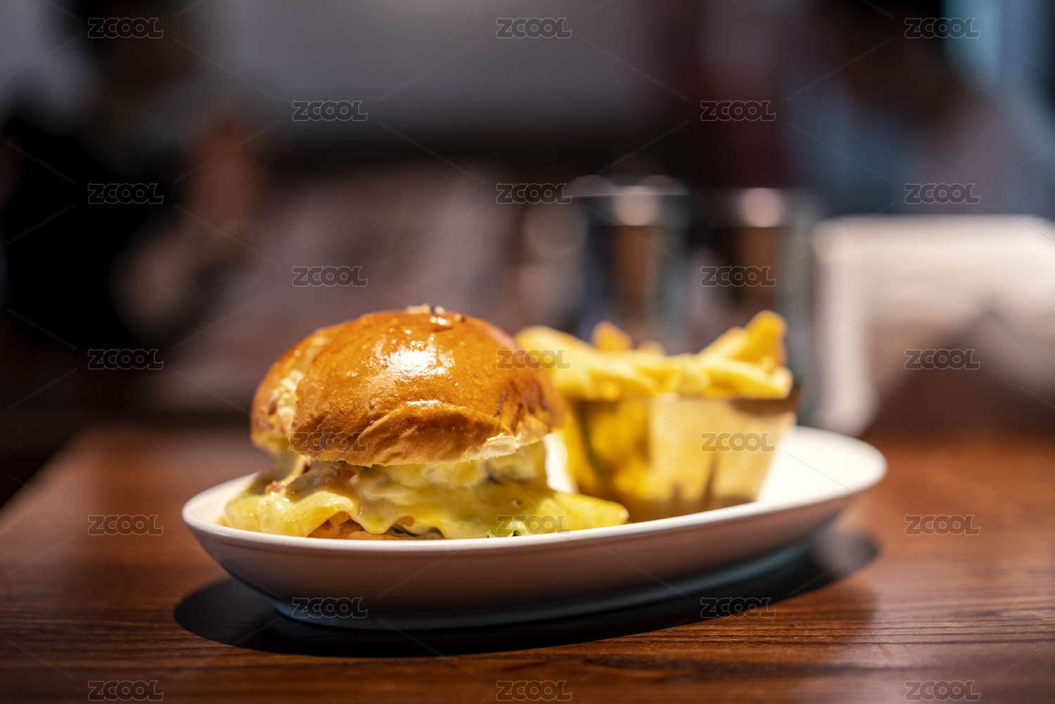 棕色木纹桌上放着一盘奶酪牛肉汉堡