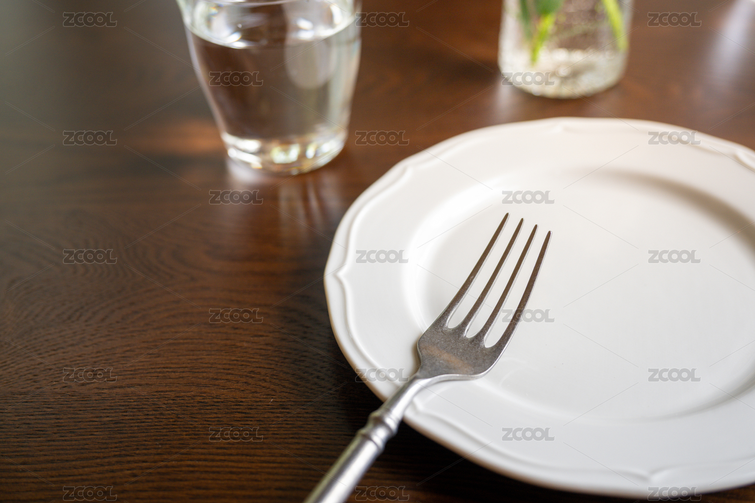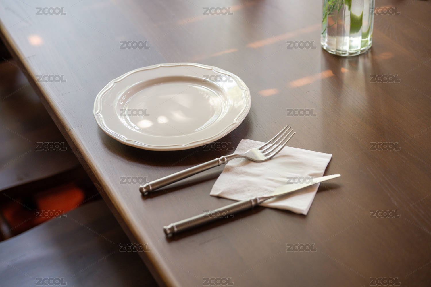 餐饮,饭店,餐厅,木制的,空,桌子,杯子,盘子,刀,叉