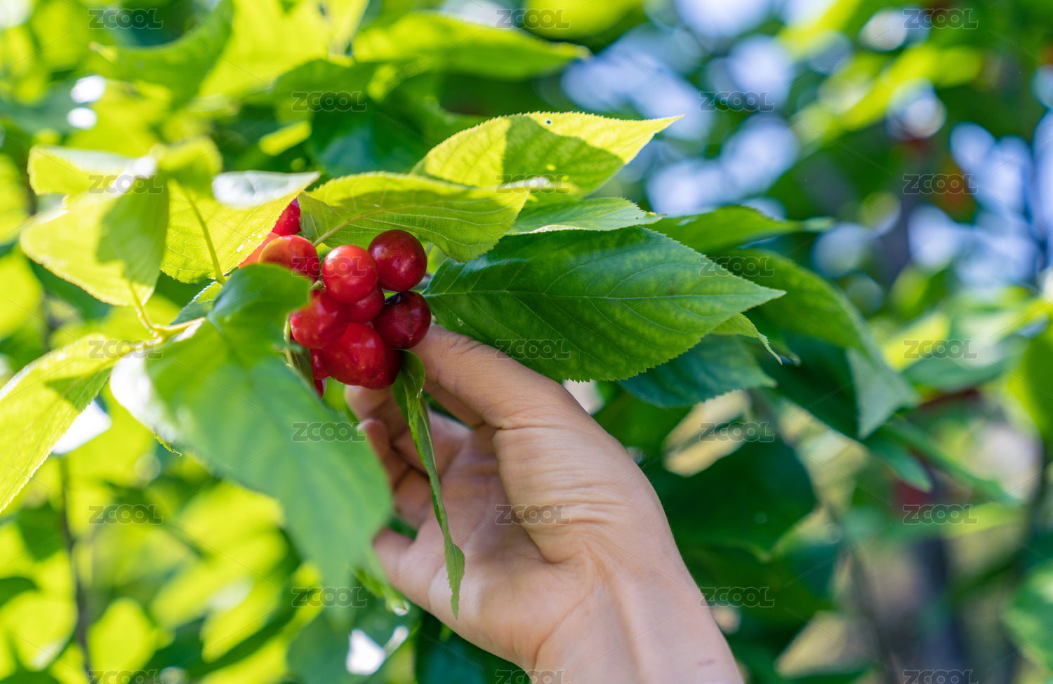 手在樱桃树枝头采摘小樱桃