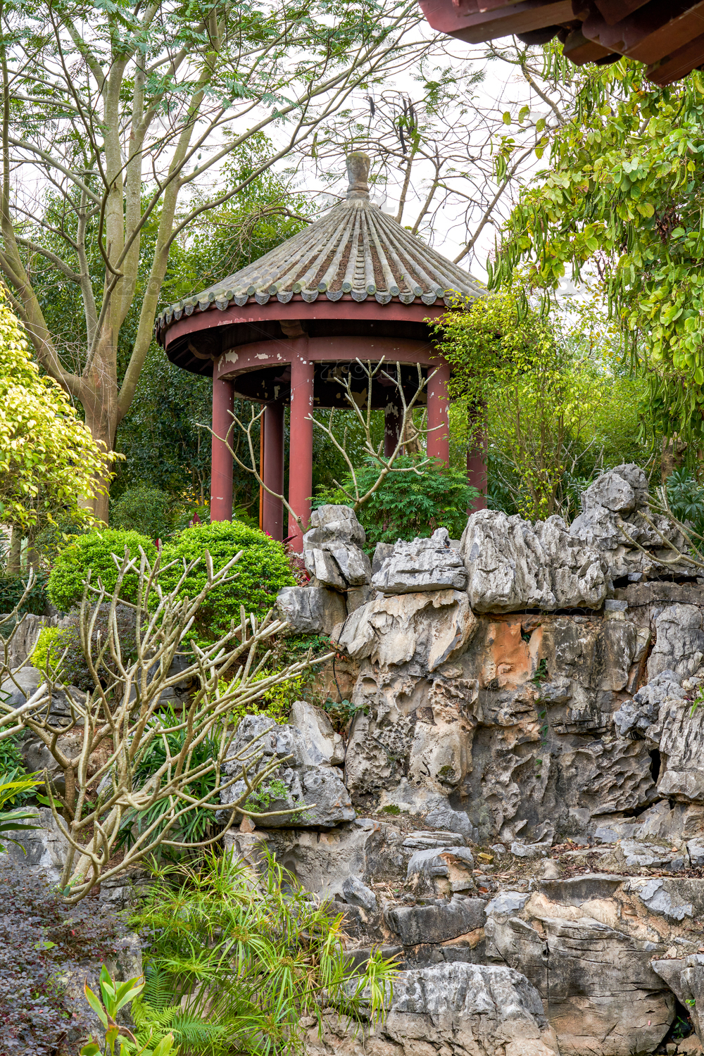 青岛百花苑景区,透过一个石洞,看到茂密的