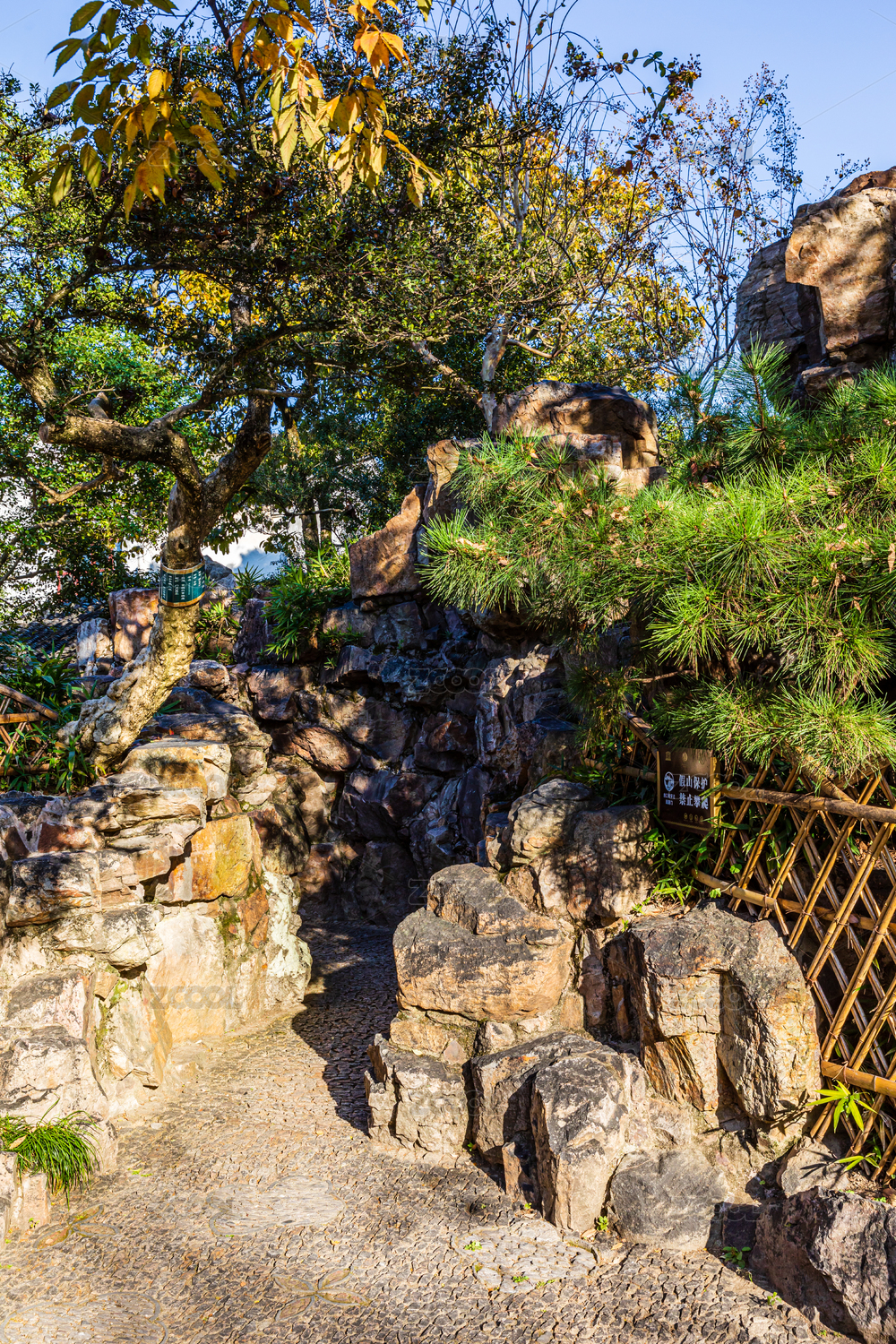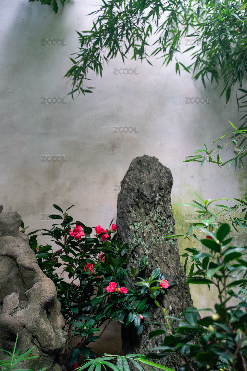 公园一角极具意的粉墙,湖石与盛开的山茶花
