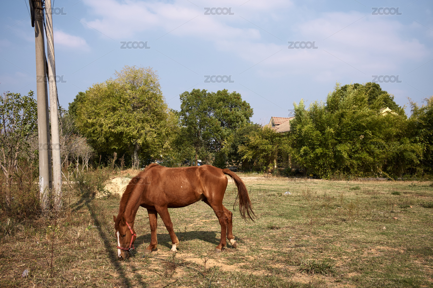 一匹枣红马在秋日午后的阳光下吃草