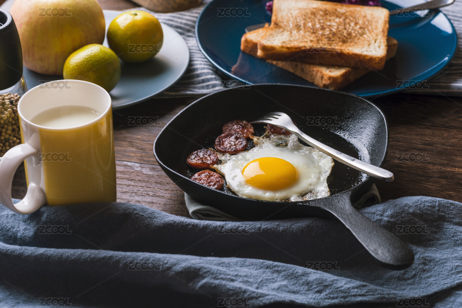 包含煎蛋面包以及香肠和水果等多种食物的丰