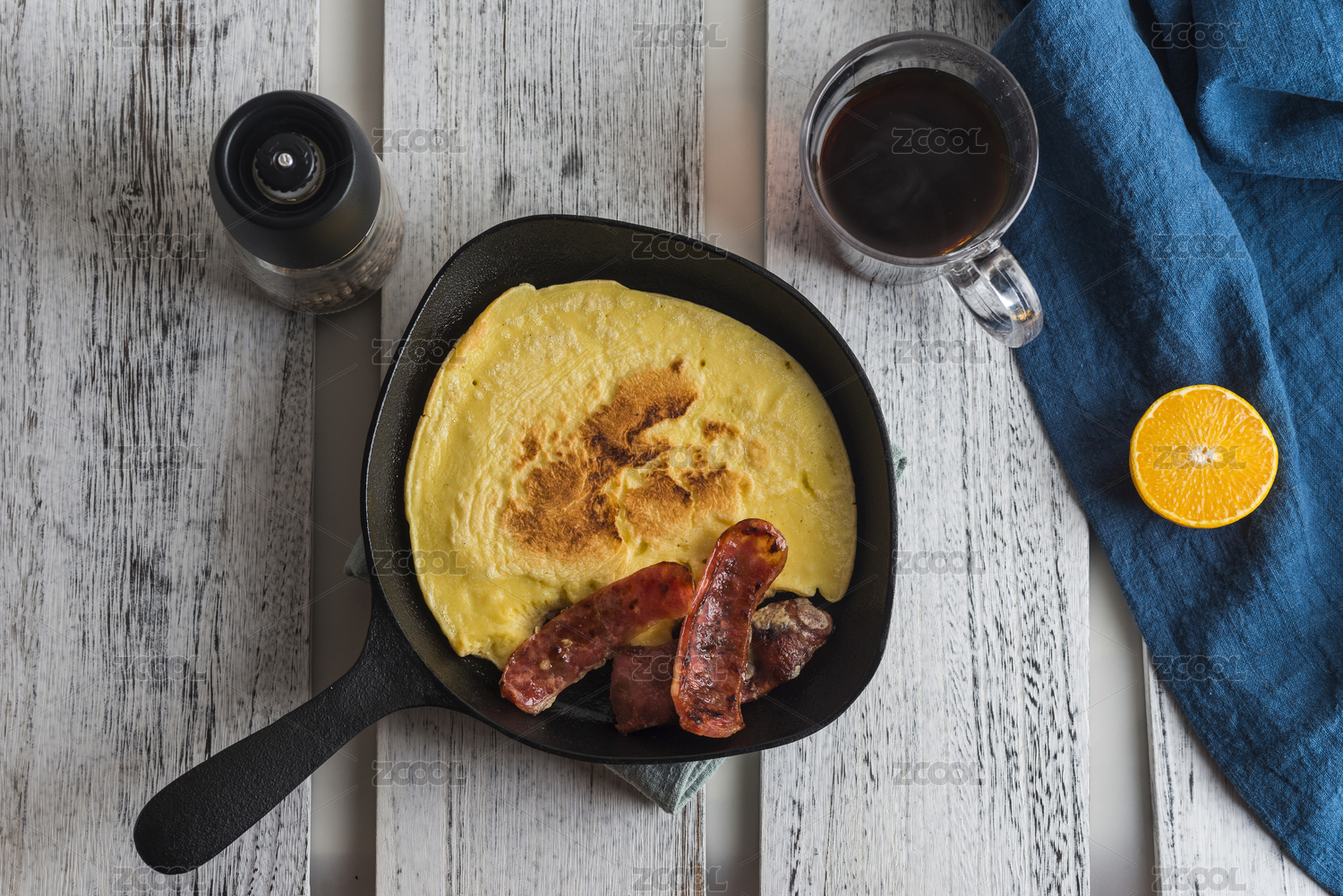 搭配美式咖啡的香肠片和鸡蛋饼早餐