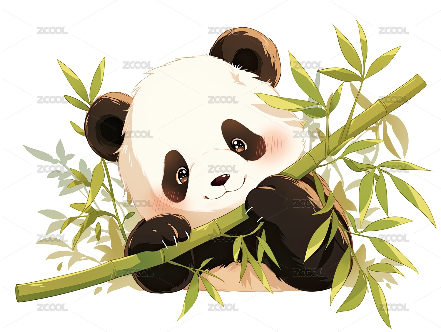 水墨插画风中国国宝吉祥物熊猫拿着竹子微笑