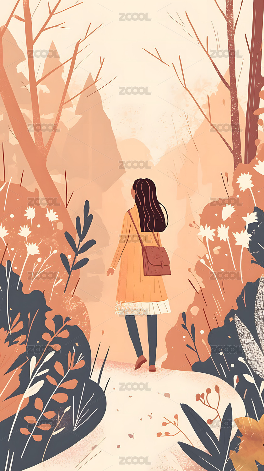 平面插画走在森林中的女孩