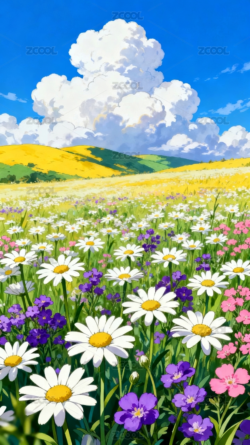 田野,野花,花朵,蓝天,白云,青山,植物,花丛