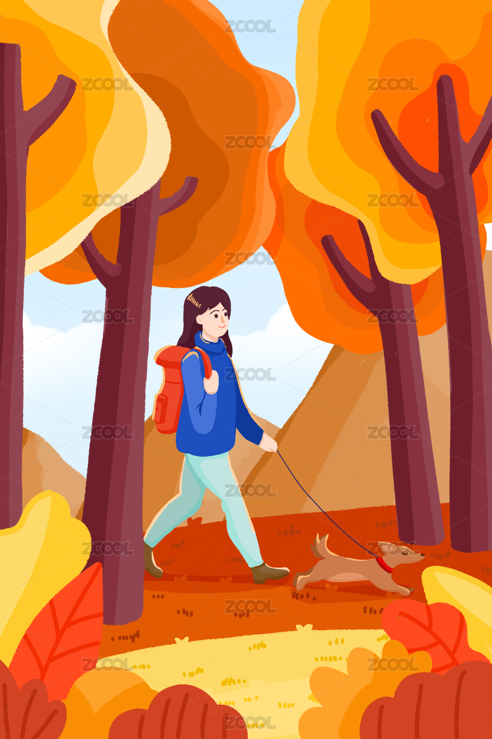 卡通手绘女孩手拿枫叶秋季秋天秋游旅行插画