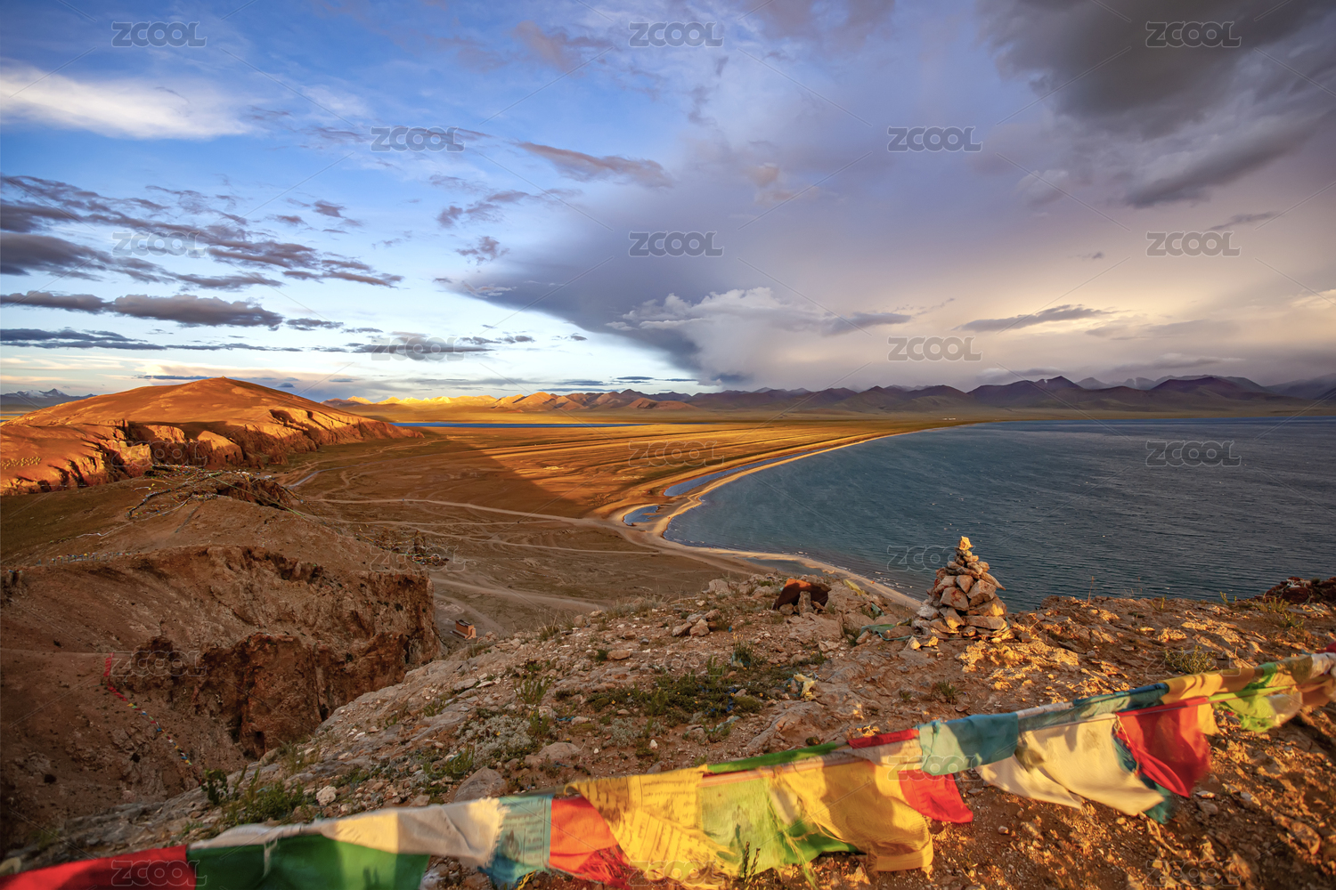 中国,西藏,纳木措,风光,日落,湖泊,蓝天,白云,玛尼堆,雪山