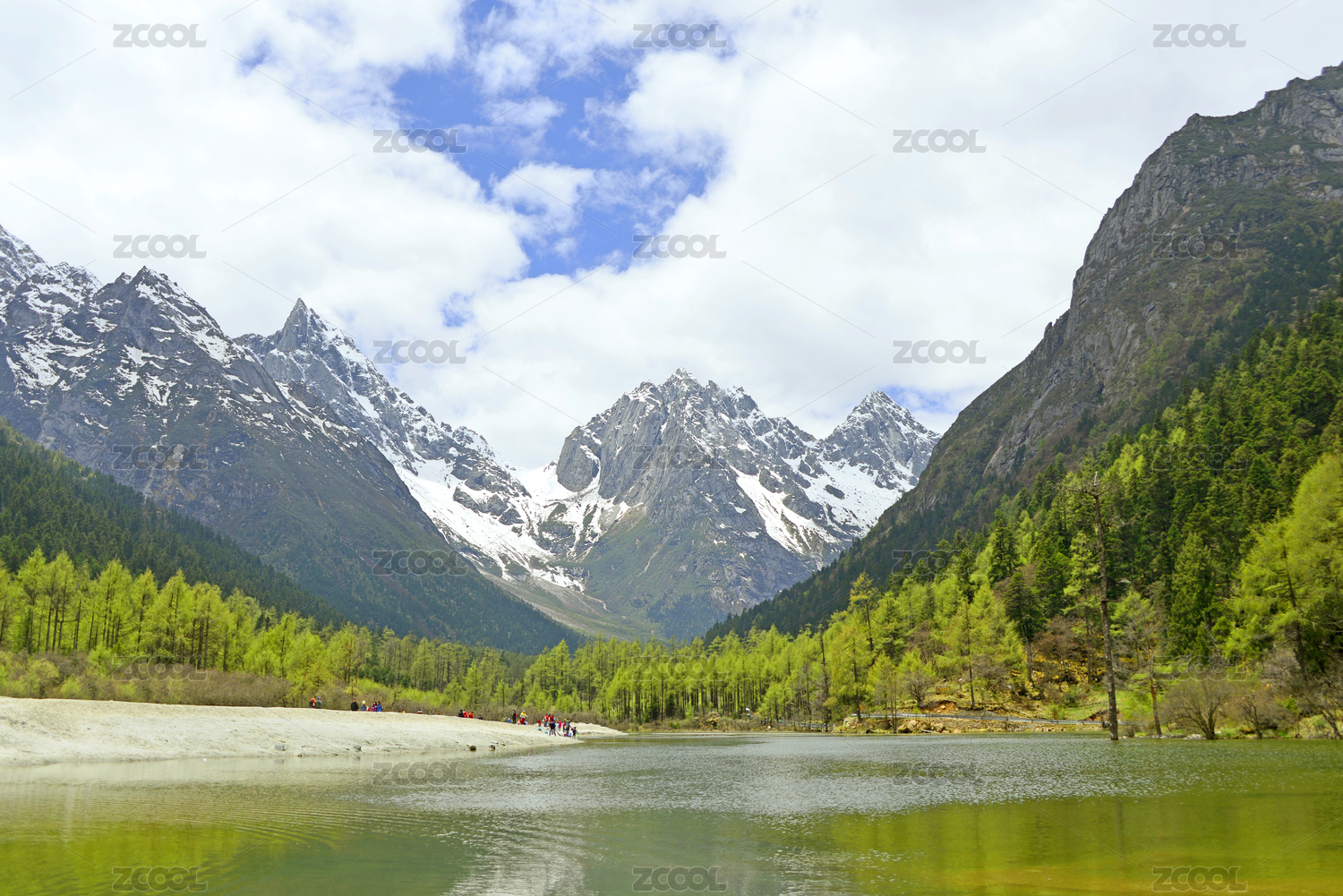 四川毕棚沟卓玛湖及水面倒影的雪山