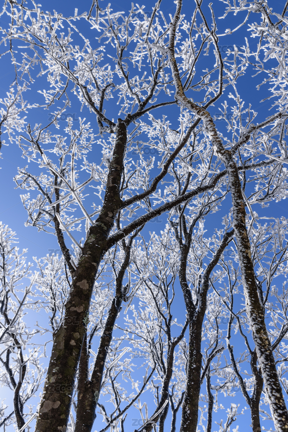 雪后蓝天和树枝上的雾凇景观