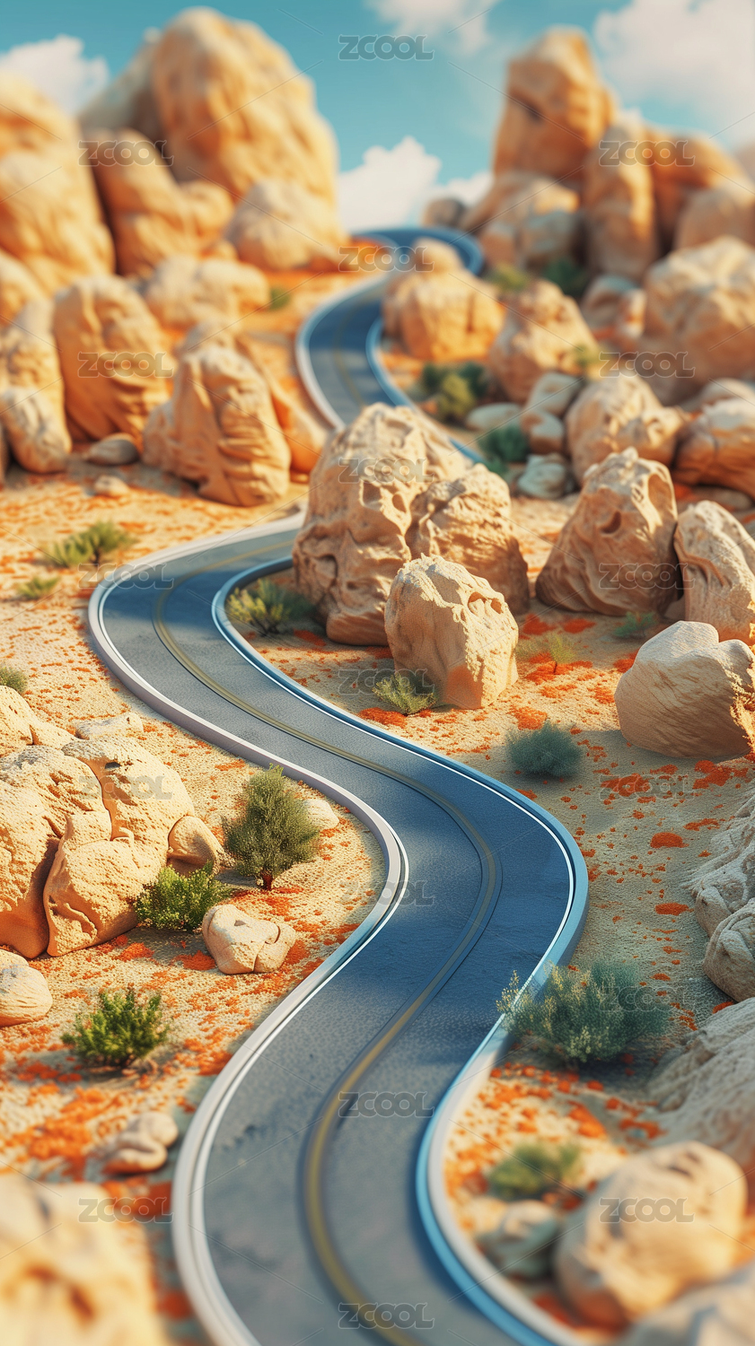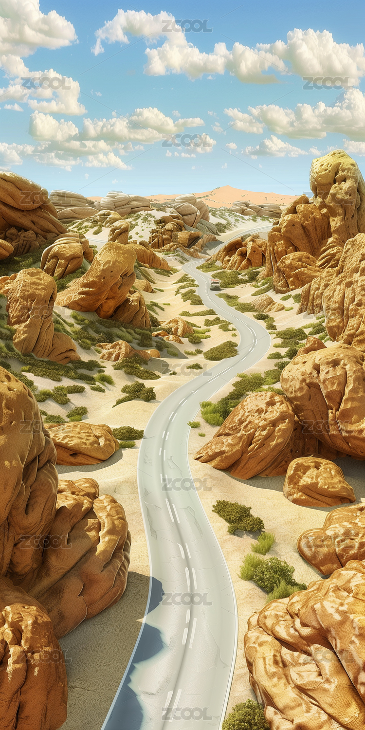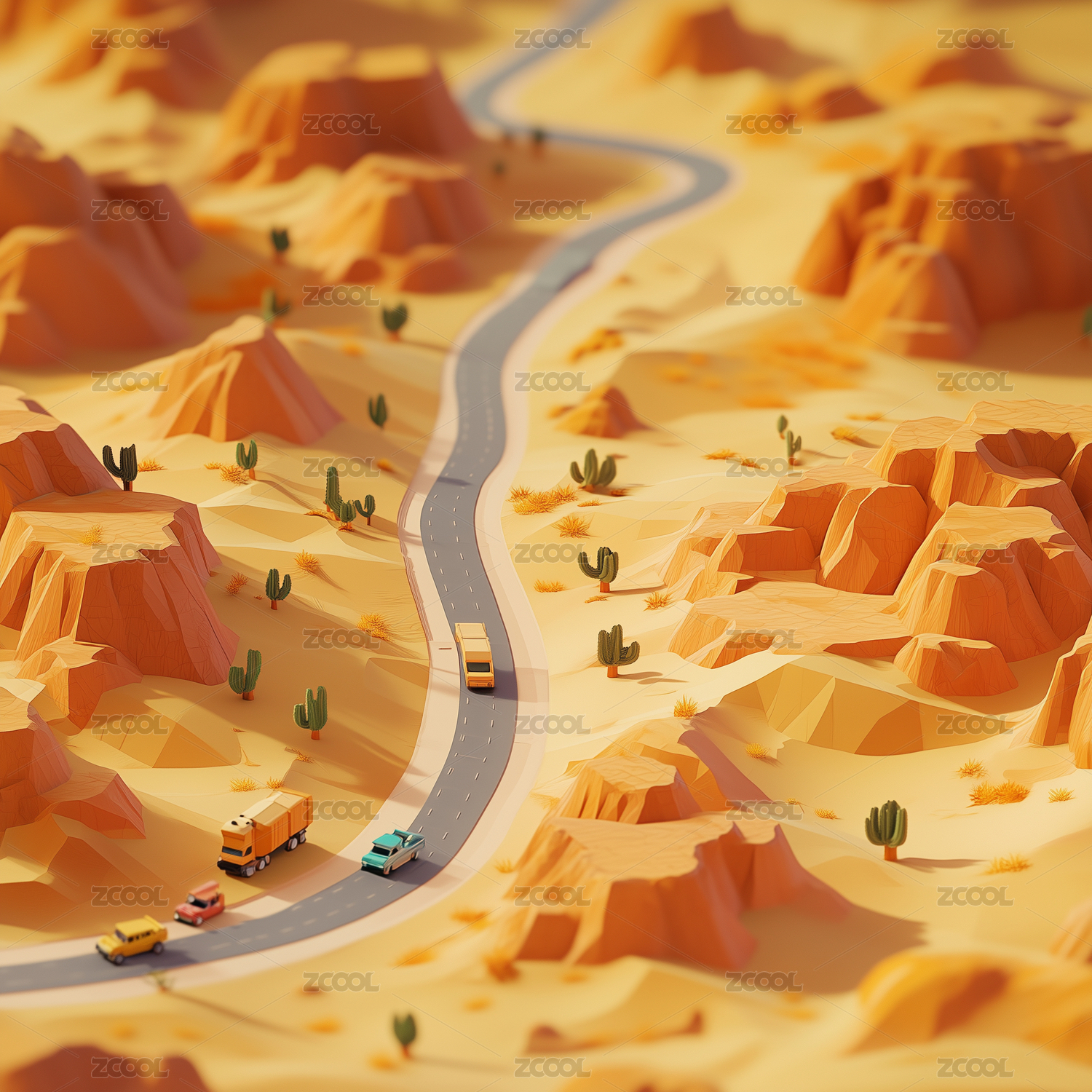 晴朗天气低面多边形沙漠上公路3D立体插画