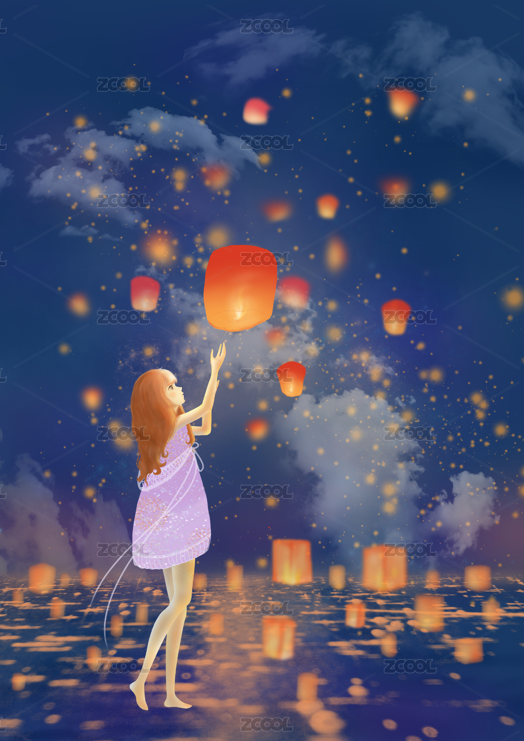 郊外夜晚放孔明灯祈福的情侣手绘插画