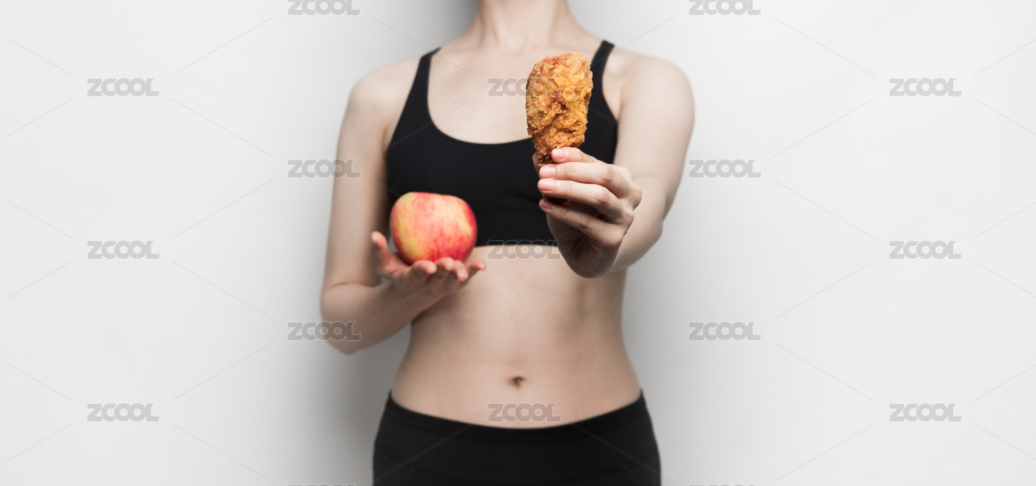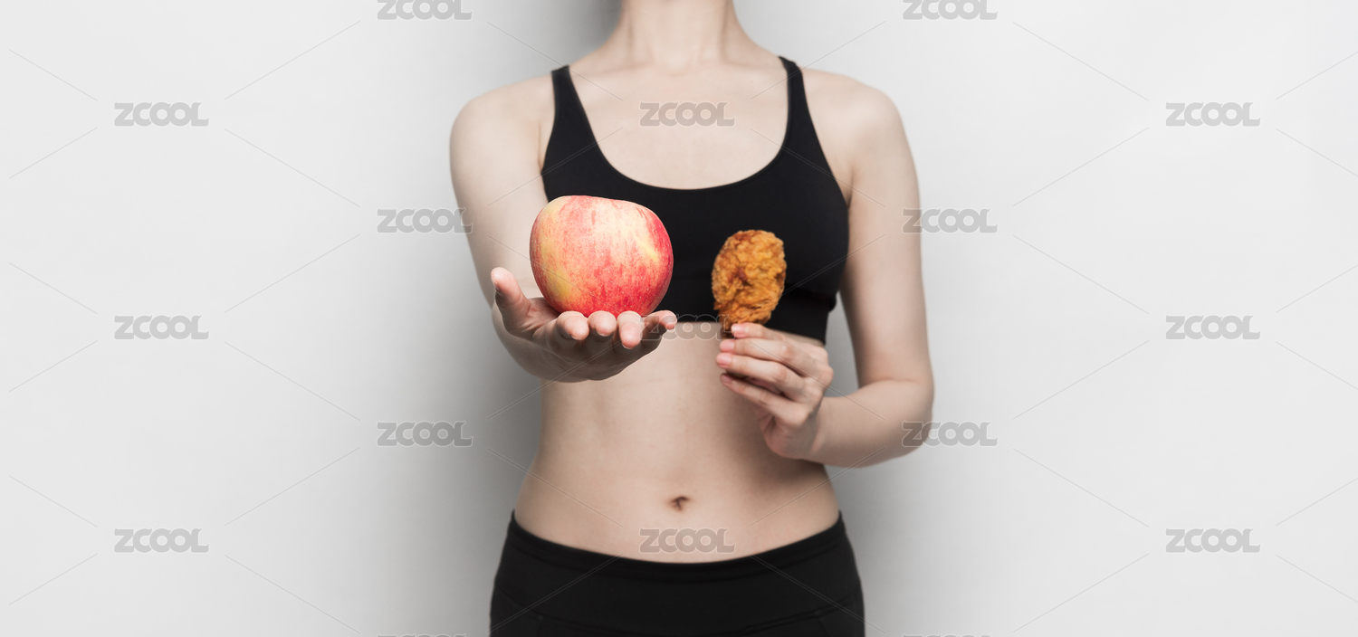 亚洲微胖人士拿着苹果拒绝伸过来的炸鸡腿