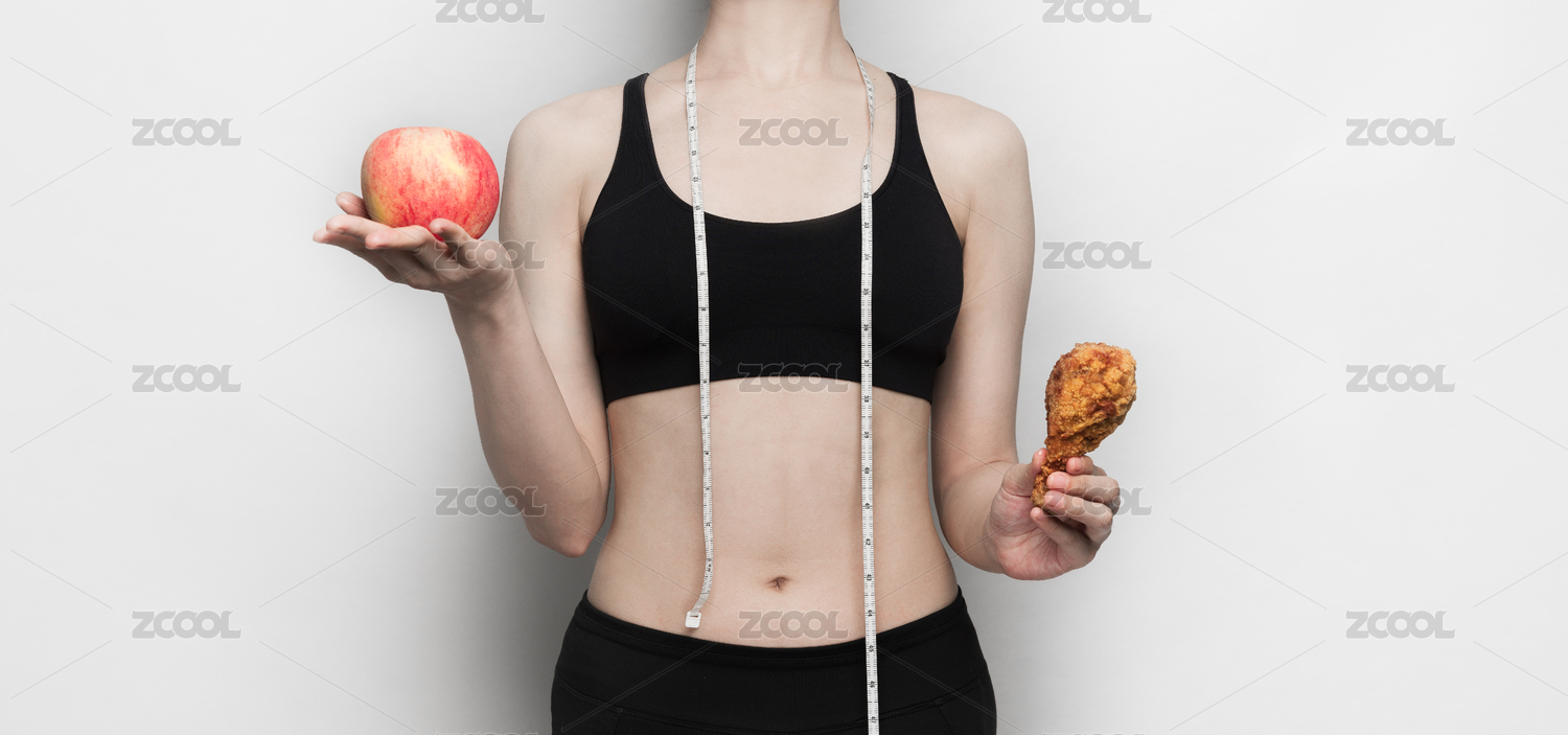 亚洲微胖人士拿着炸鸡腿和苹果在权衡