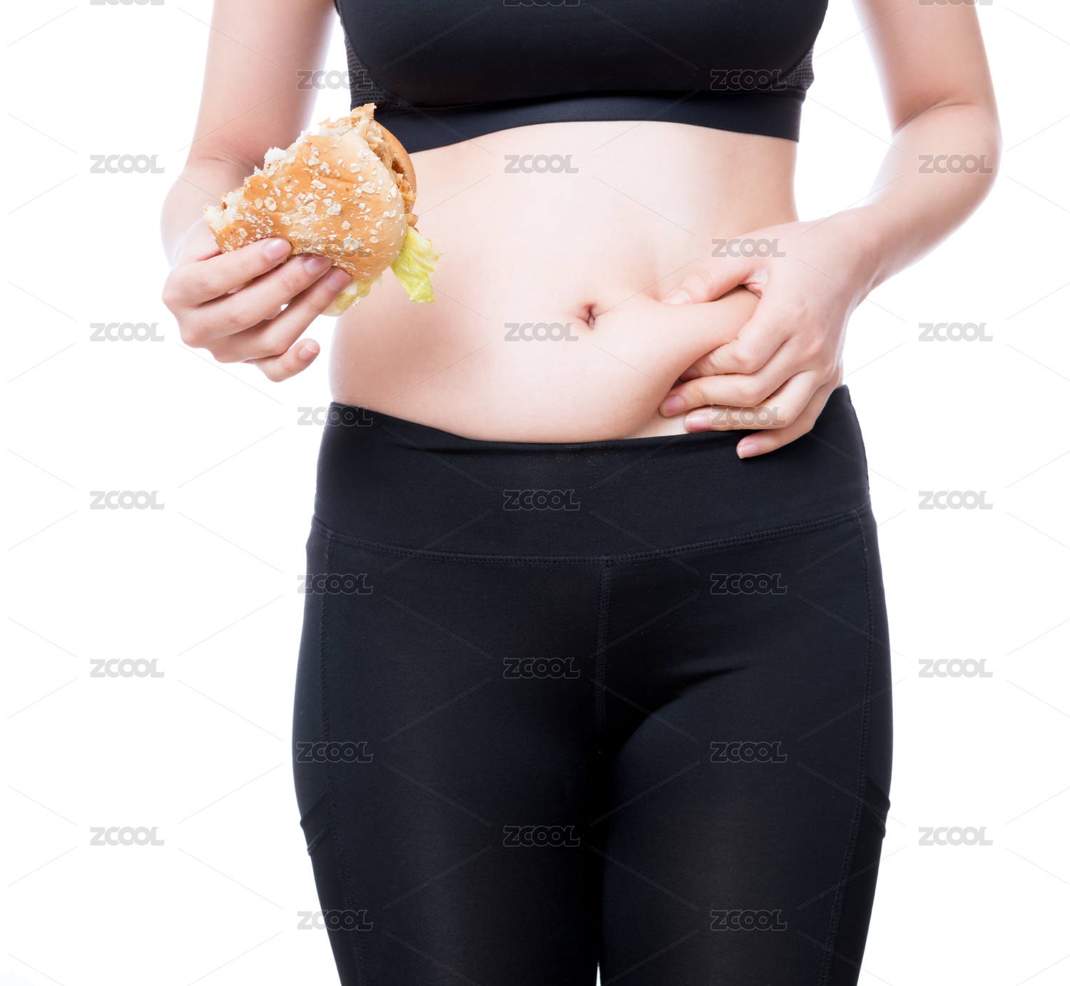 年轻的女生手里拿着汉堡,另一只手捏着肚子上多余的肥肉
